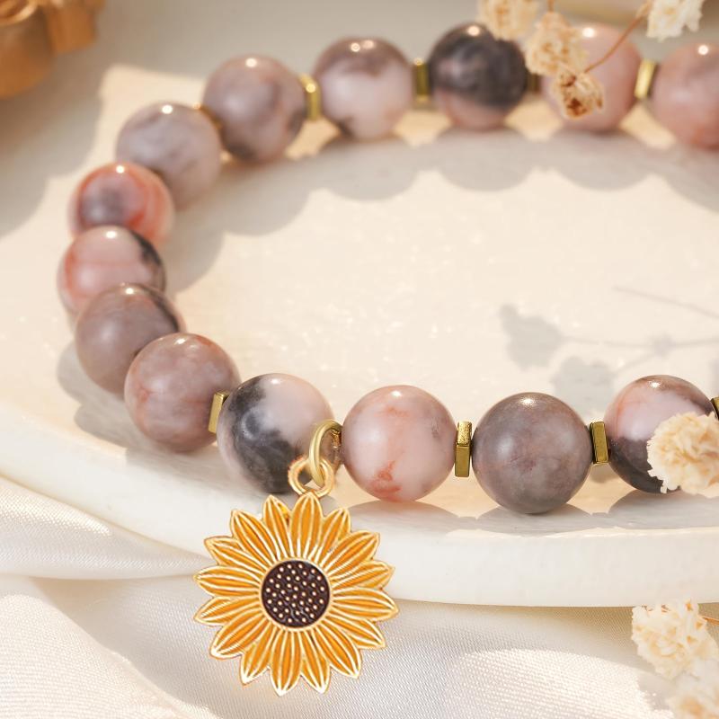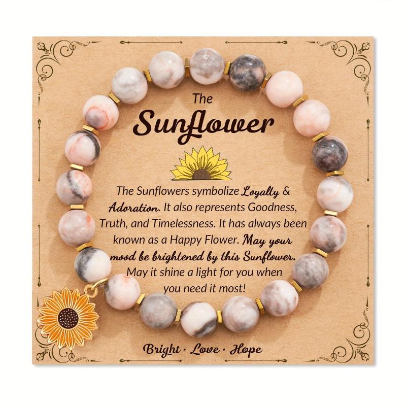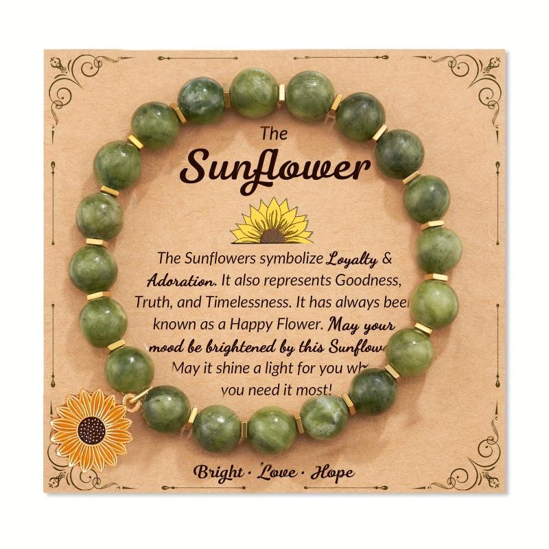 This adjustable sunflower bracelet features natural stone beads and comes with an inspirational card. Perfect gift for birthdays, Christmas, or any occasion.