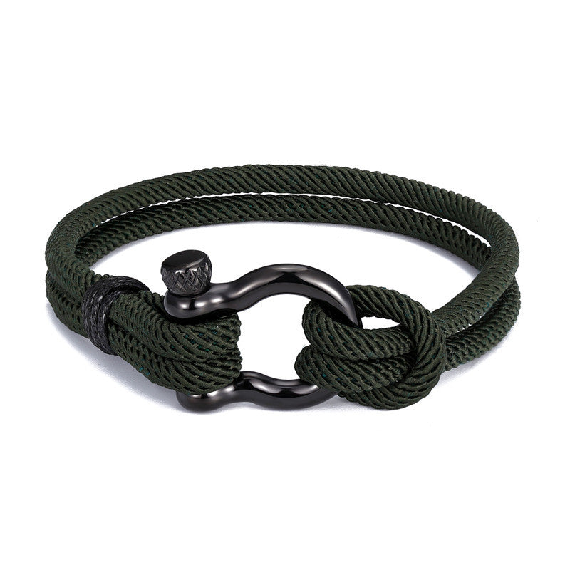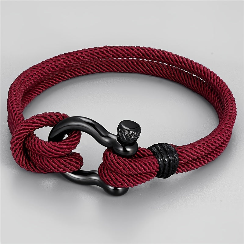 This stainless steel bracelet is designed for outdoor survival situations. It features a horseshoe buckle and can be used for camping, rescue, and emergency situations.