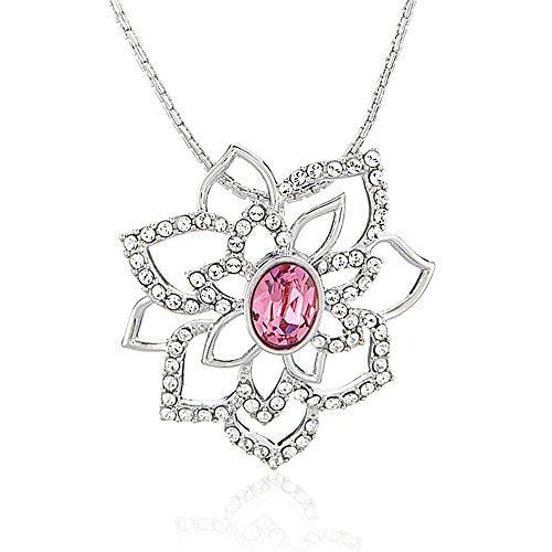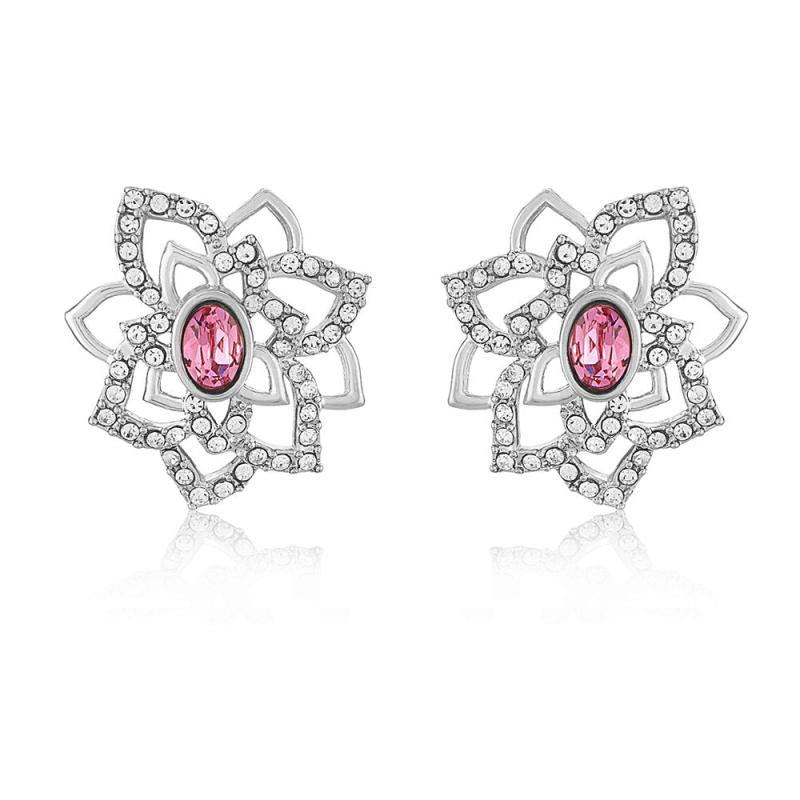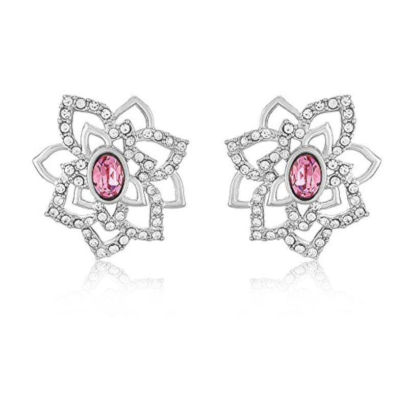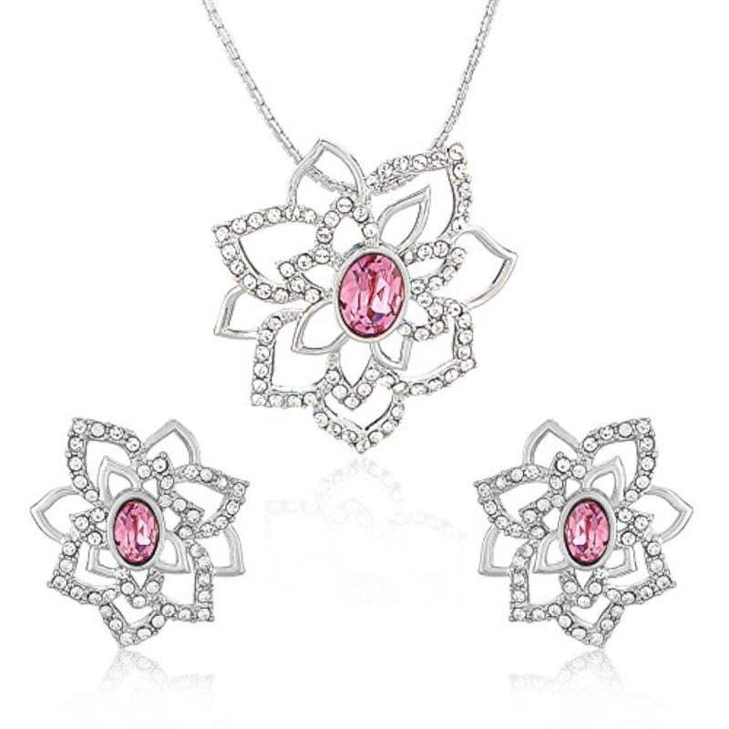Elegant pendant set featuring a pink rose flower design with Swarovski Crystals, rhodium plated for a luxurious look.