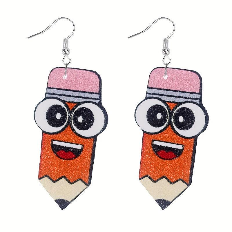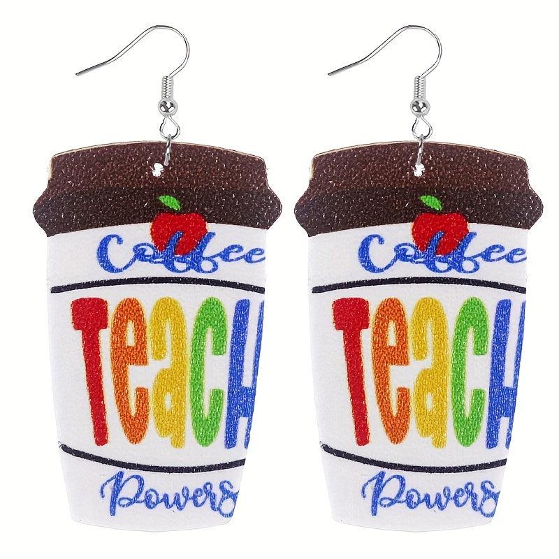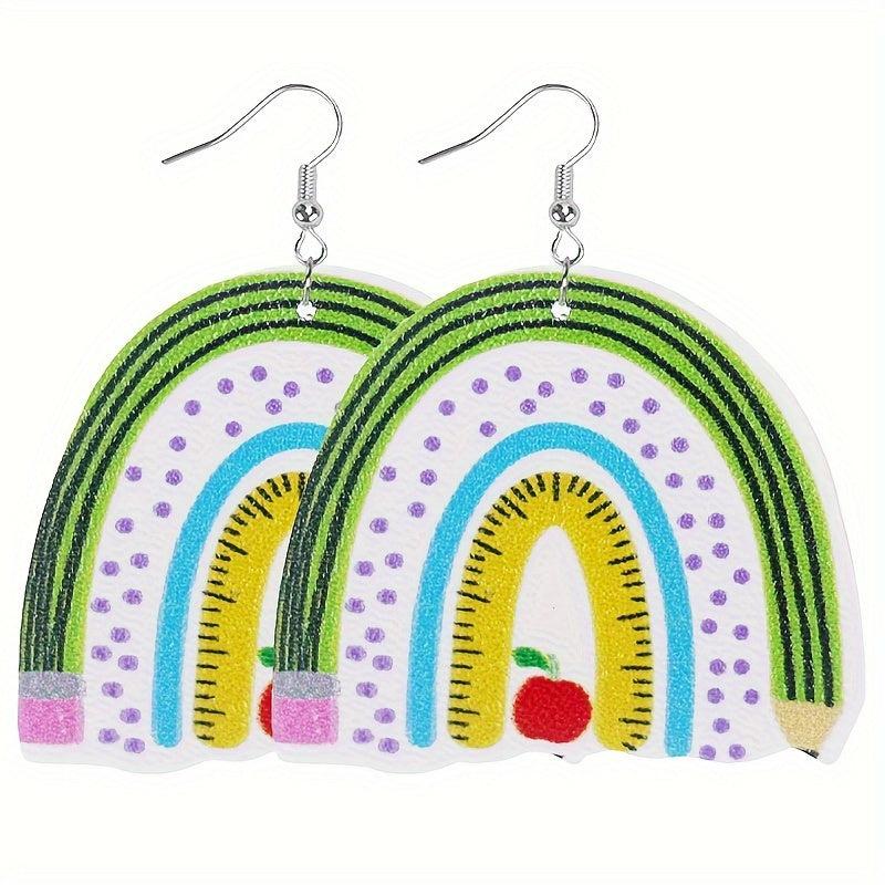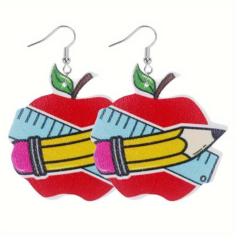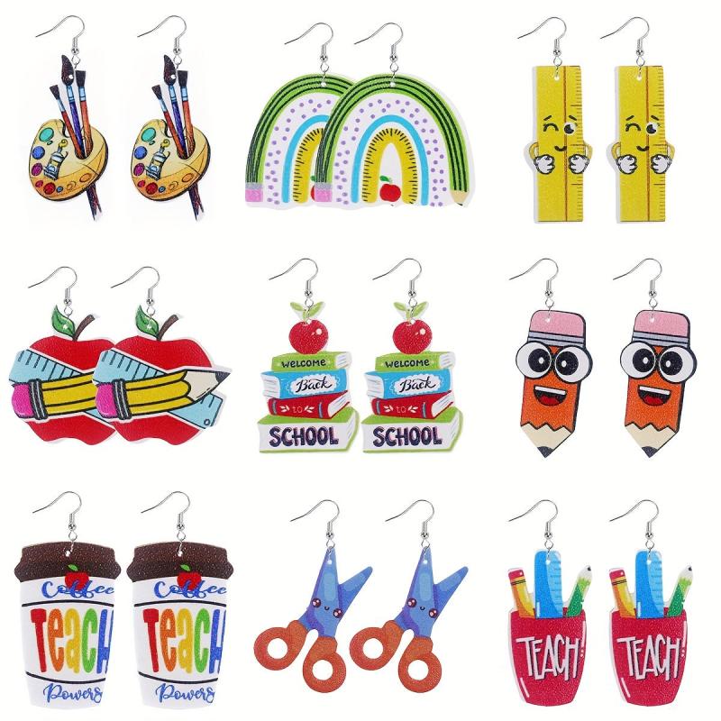 Get ready for the school year with this set of 9 pairs of teacher-themed faux leather earrings. Features pencil, rainbow, apple, coffee cup, scissors, and ruler designs. Perfect for teachers or students!