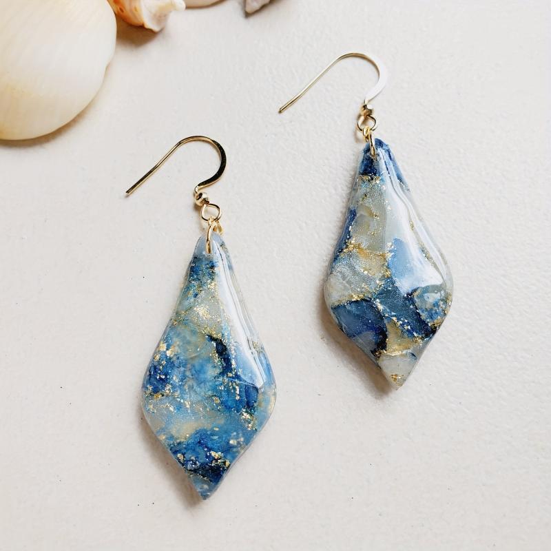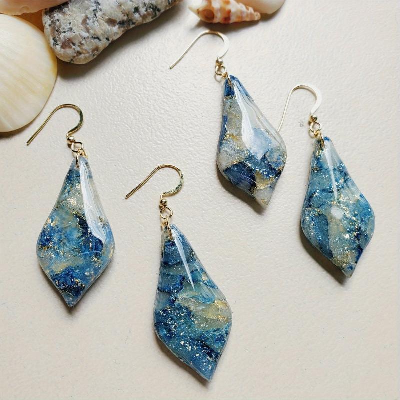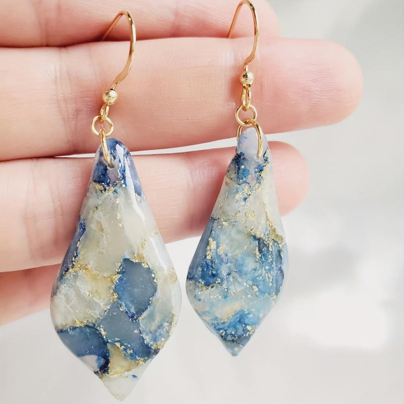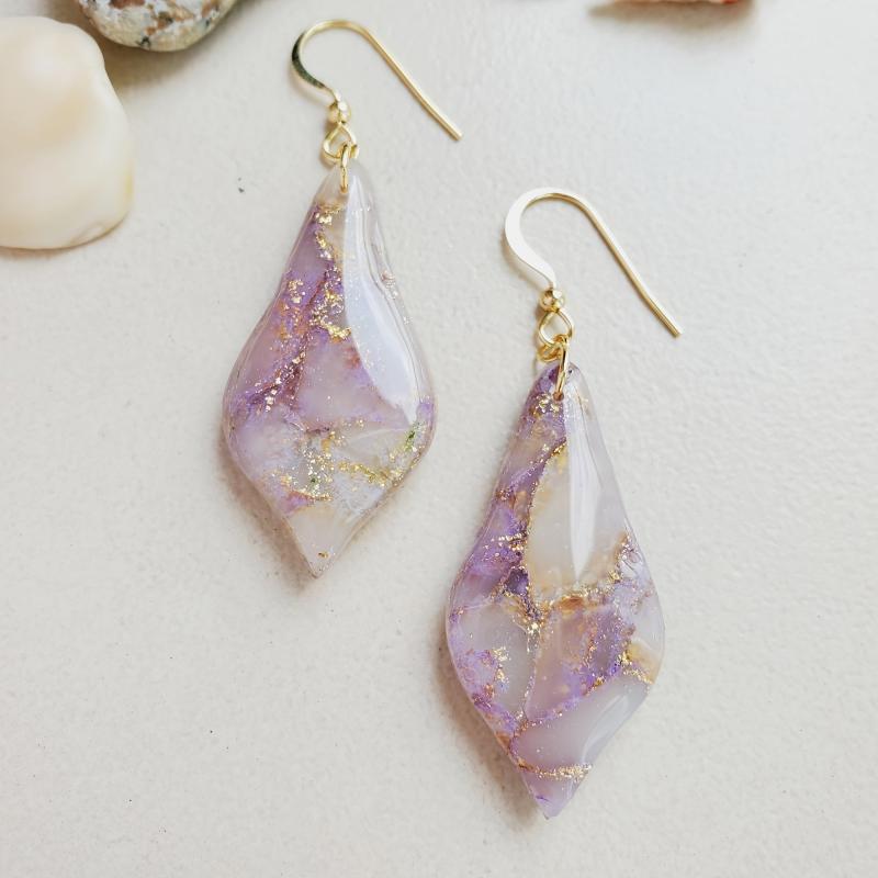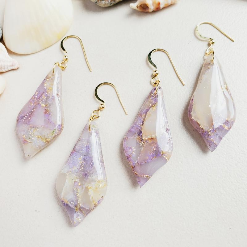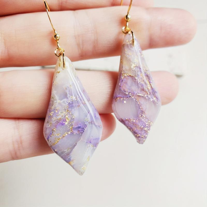 Elevate your look with these stylish teardrop polymer clay earrings inspired by French fashion. Features a faux amethyst pendant on a copper ear needle, perfect for a vacation look. Ideal for those born in February.