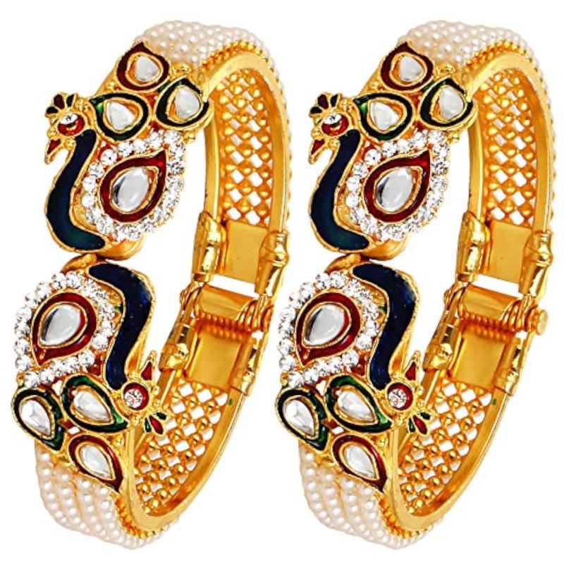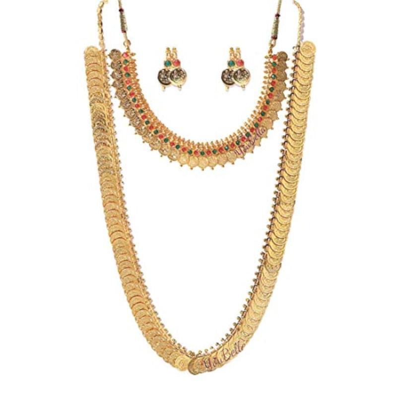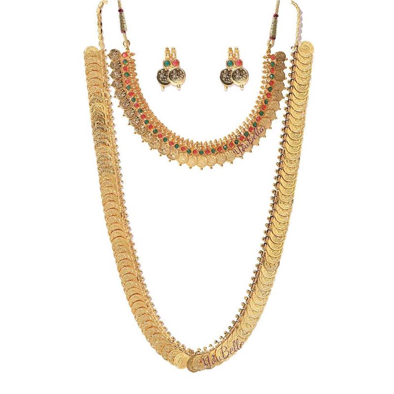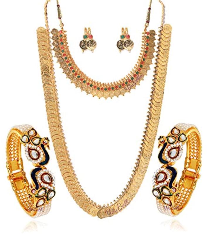 Elegant set featuring a long traditional Maharani temple coin necklace and a stunning pearl-studded wedding bracelet bangle. Perfect for weddings and special occasions.