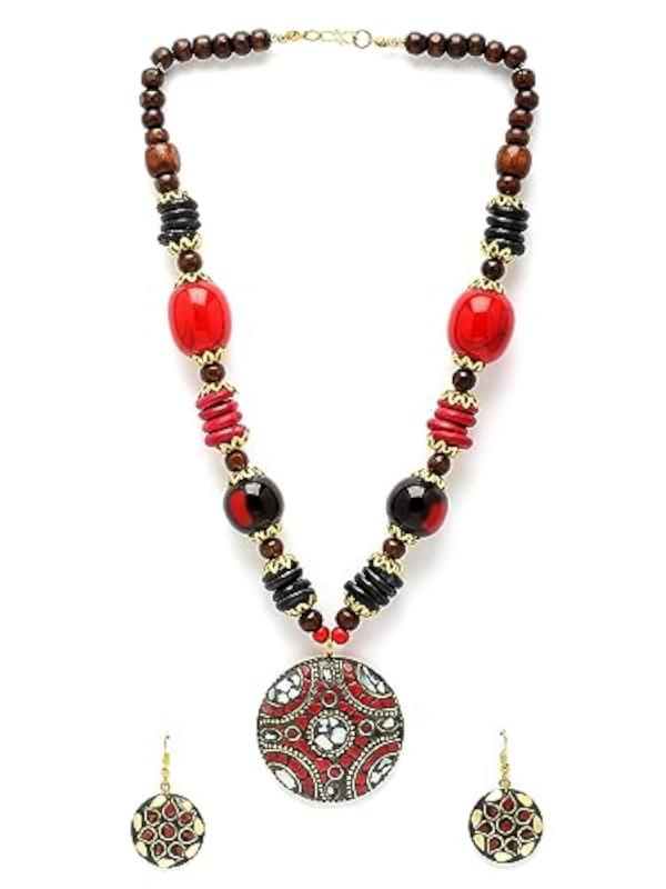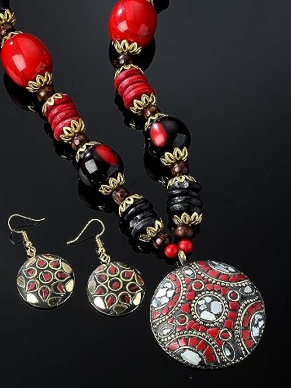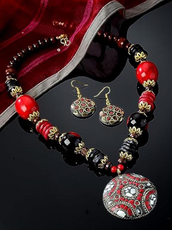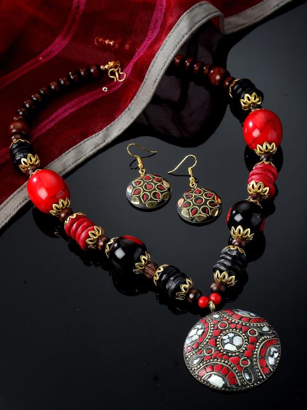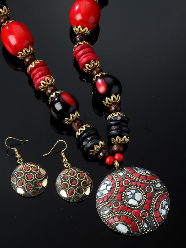 Elegant Tibetan jewelry set featuring an oxidised pendant and matching necklace, perfect for any occasion.