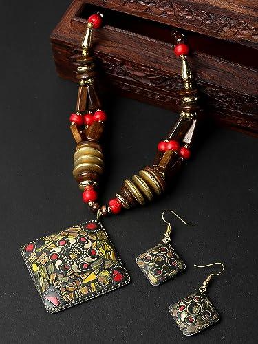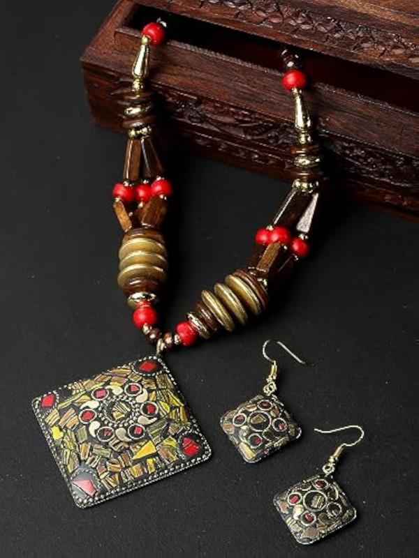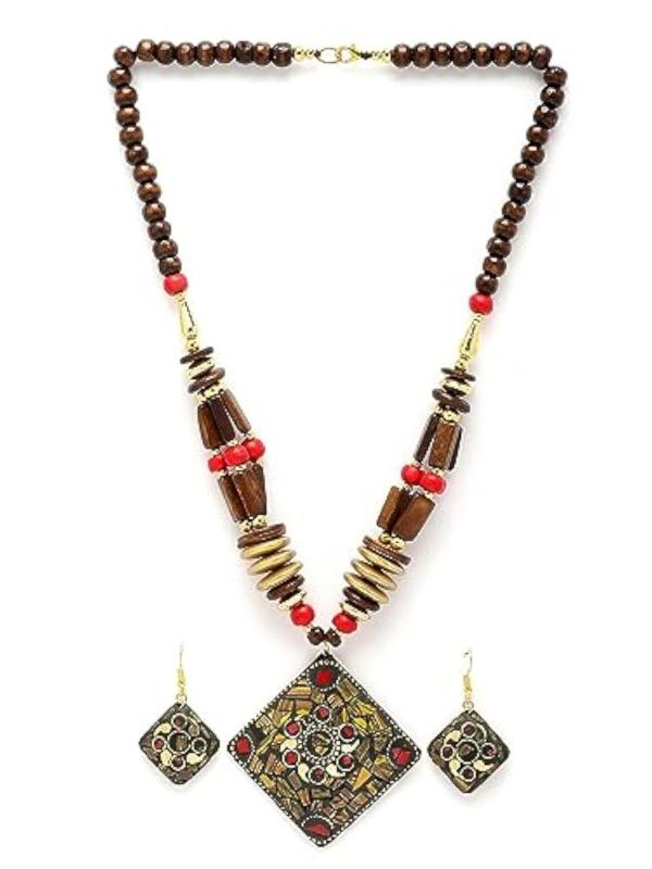 Elegant Tibetan style pendant necklace with oxidised finish. This set is perfect for adding a touch of boho chic to your look.