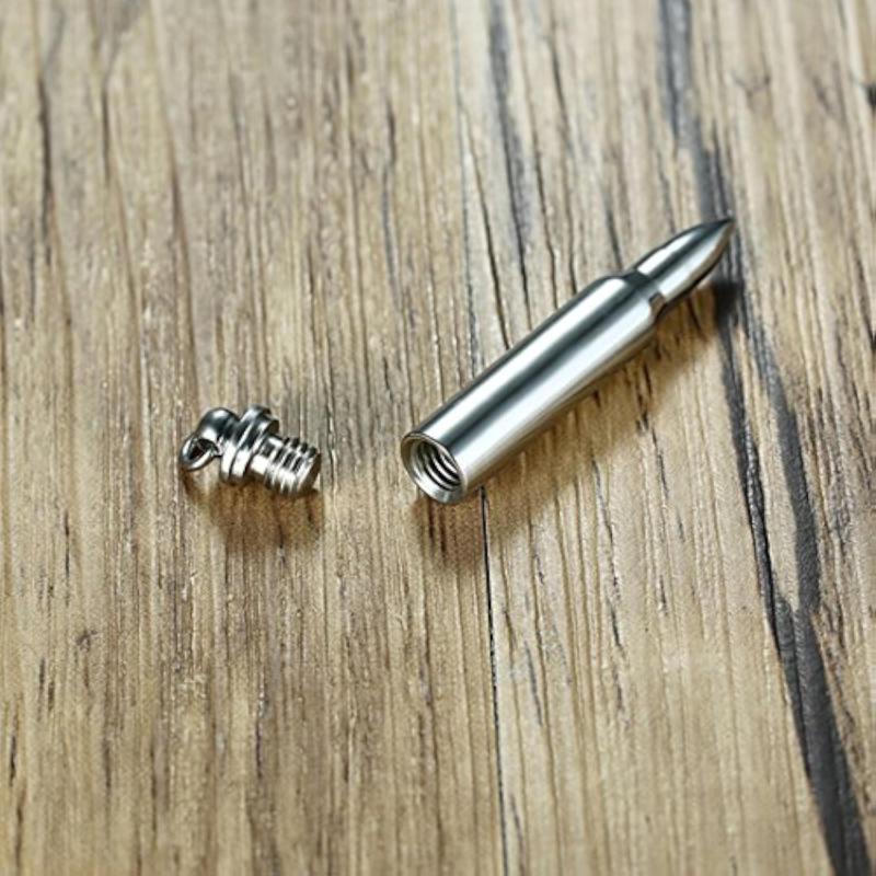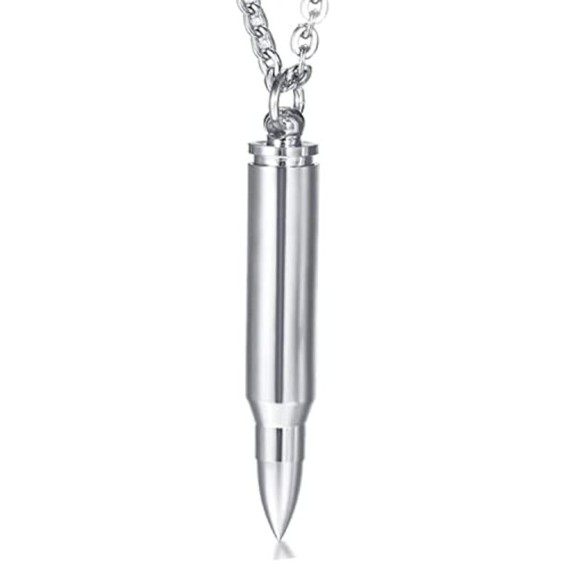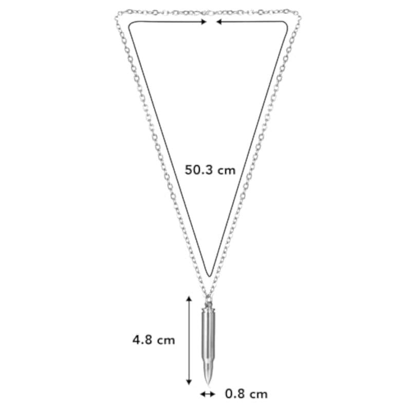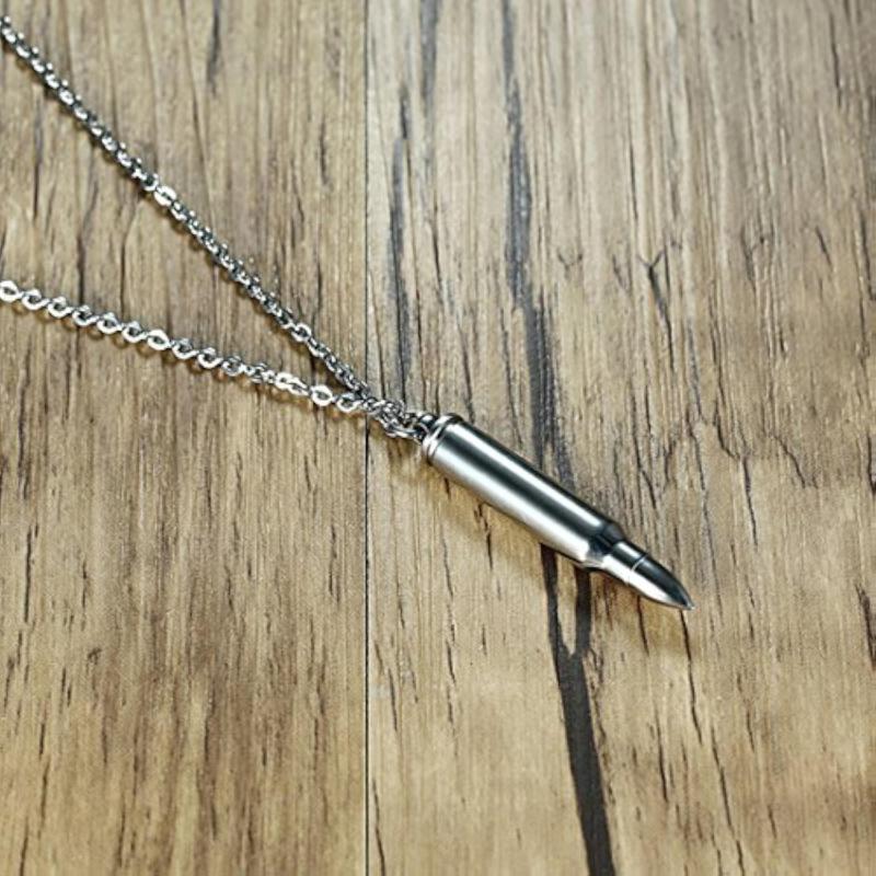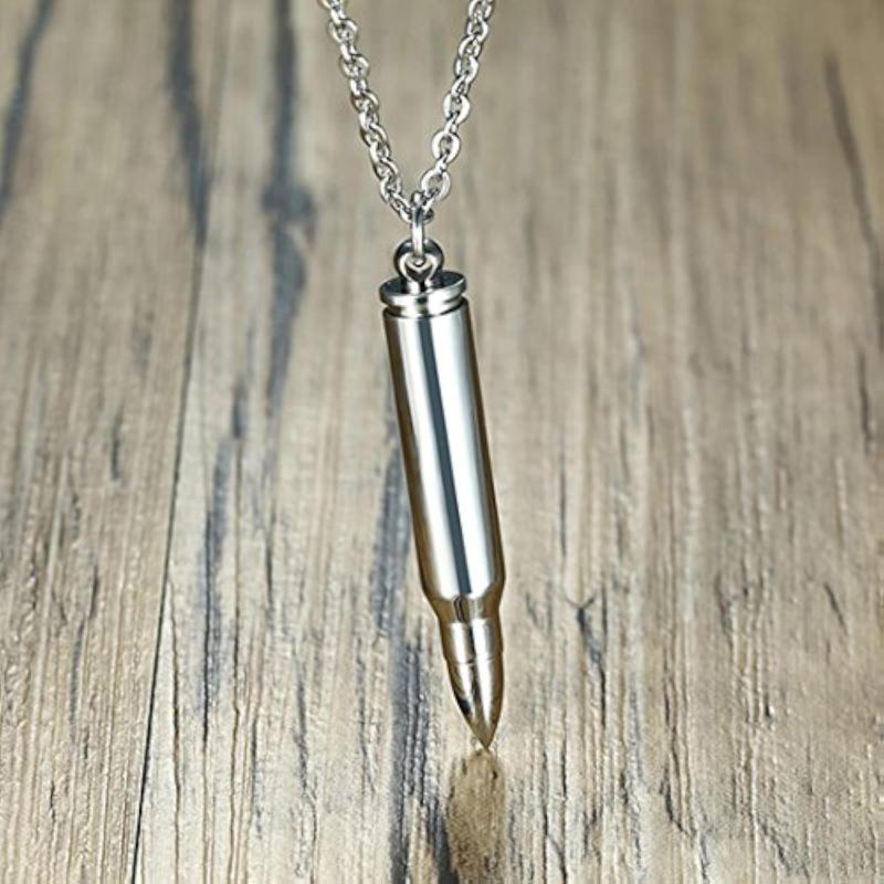 This stylish necklace features a plated titanium stainless steel rifle bullet pendant.