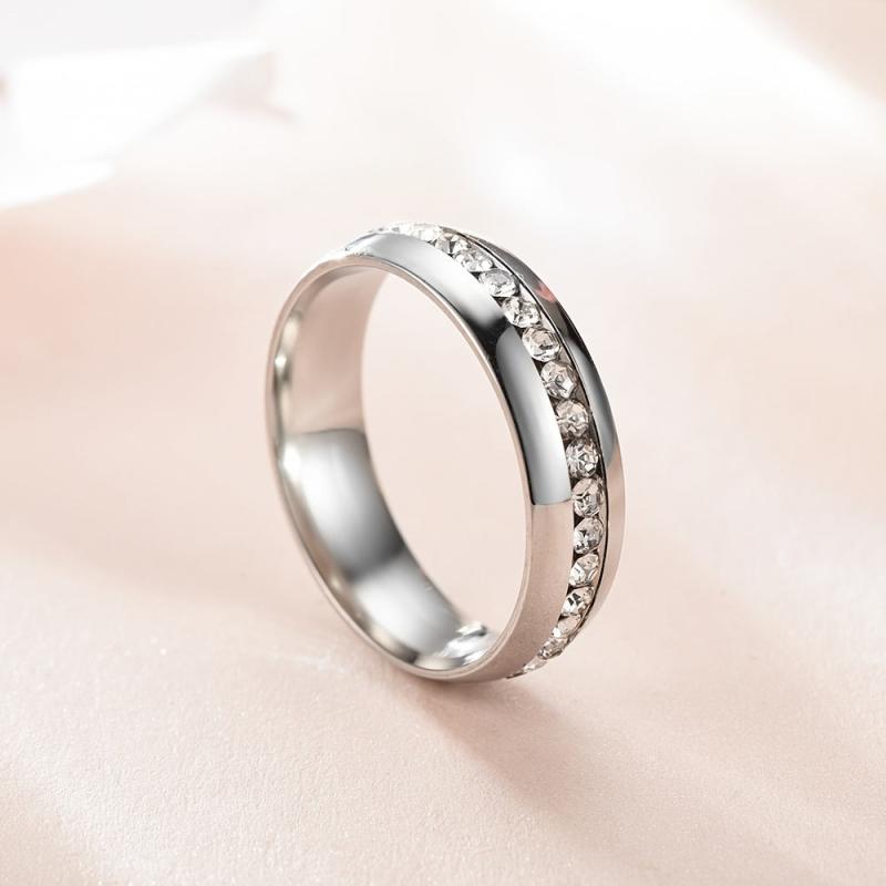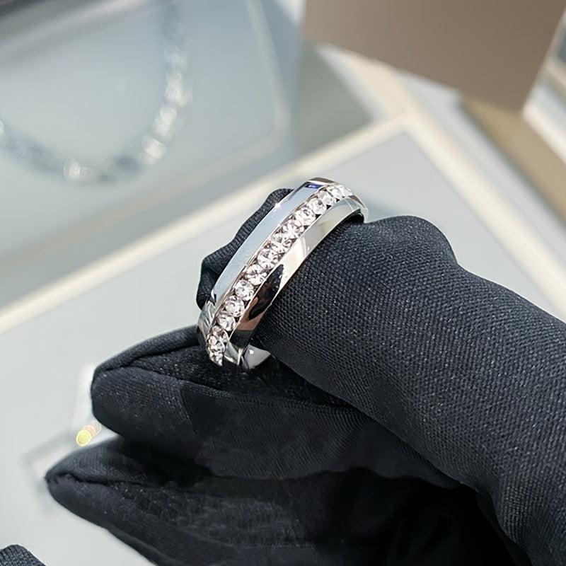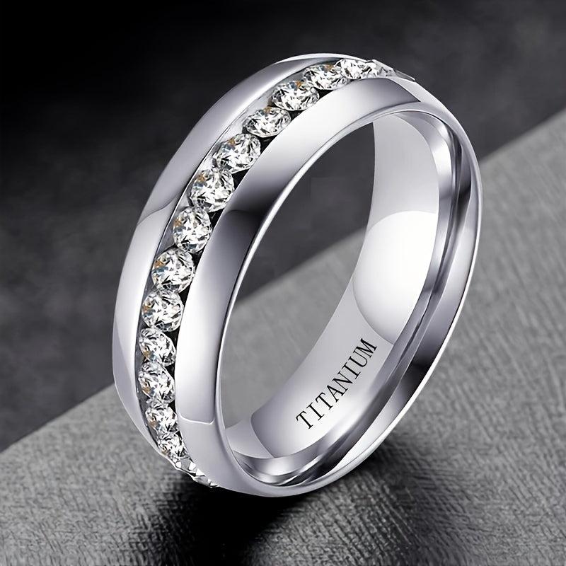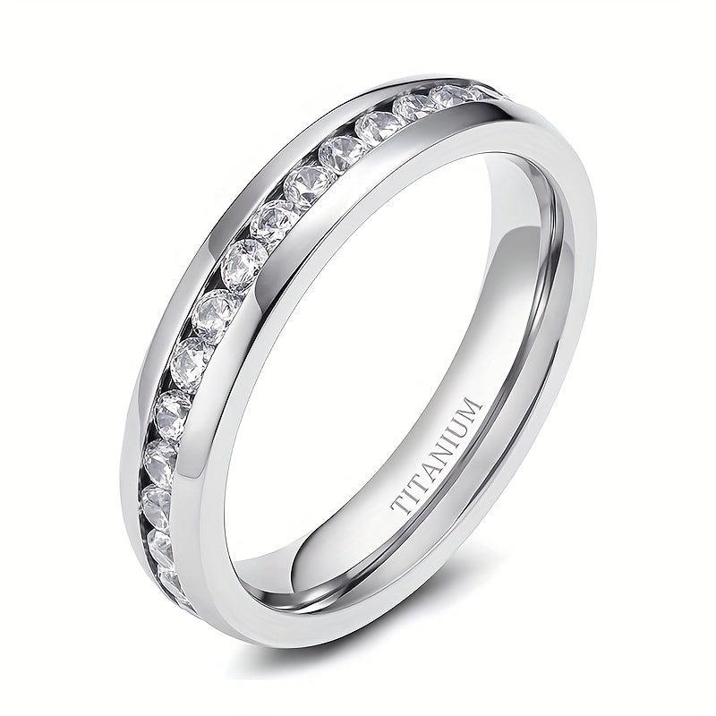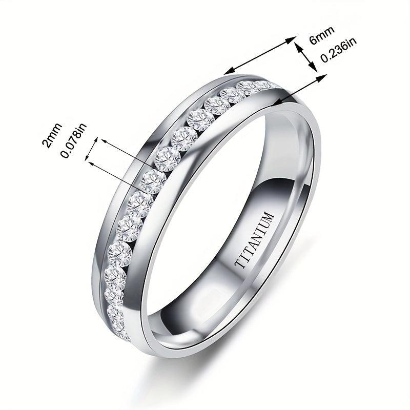 Elegant titanium wedding band featuring a 6mm round synthetic zirconia stone. Perfect for engagements or as a gift. Unisex design in a silvery color.