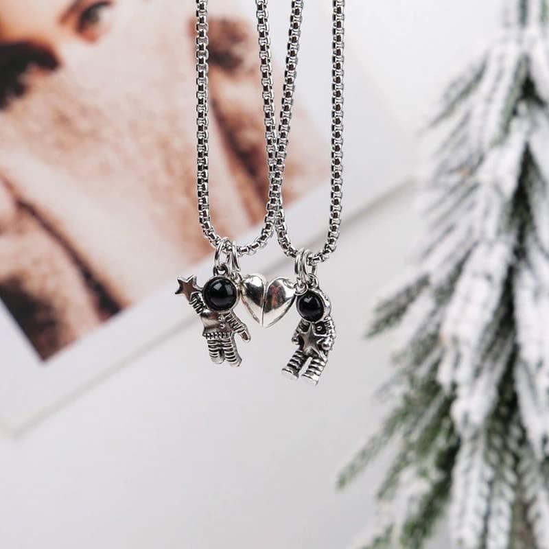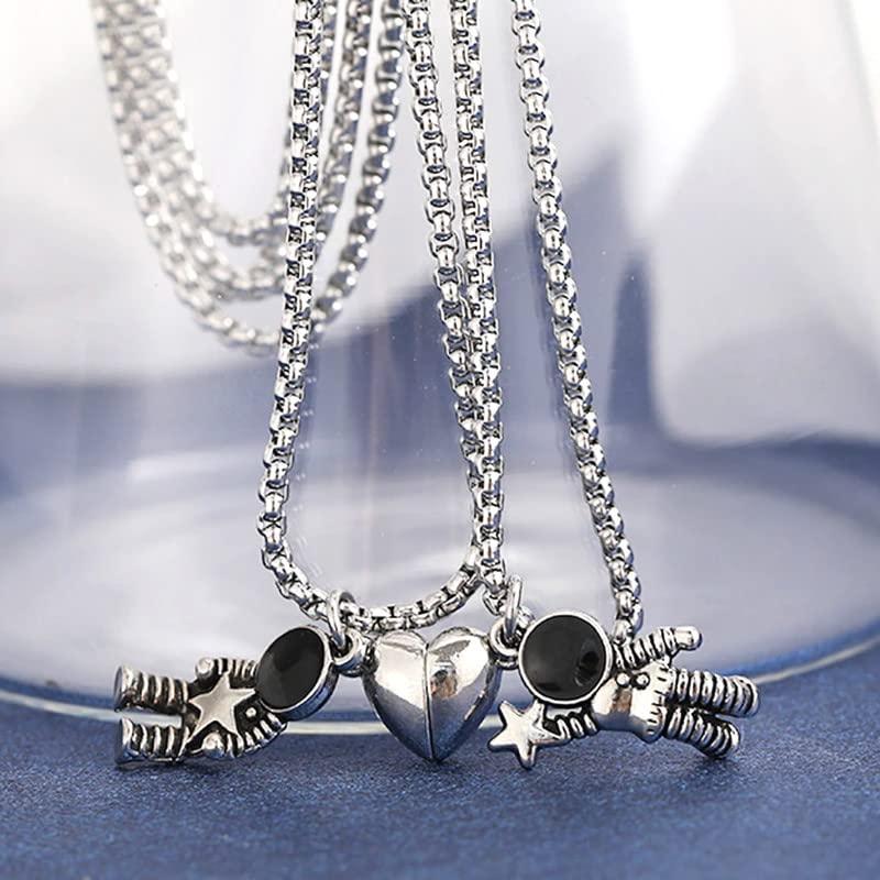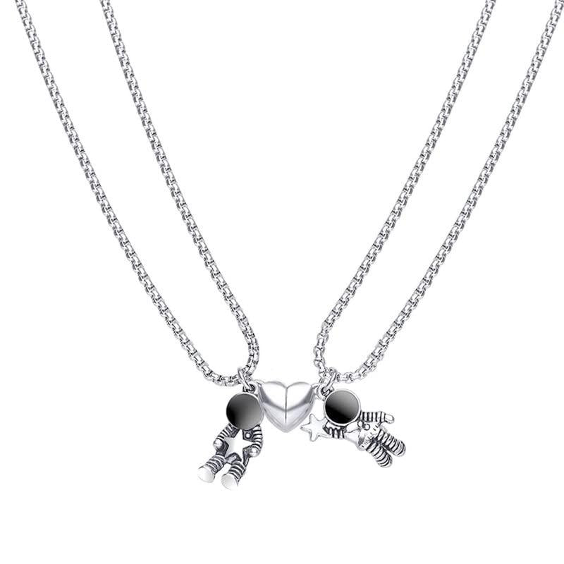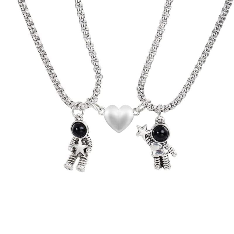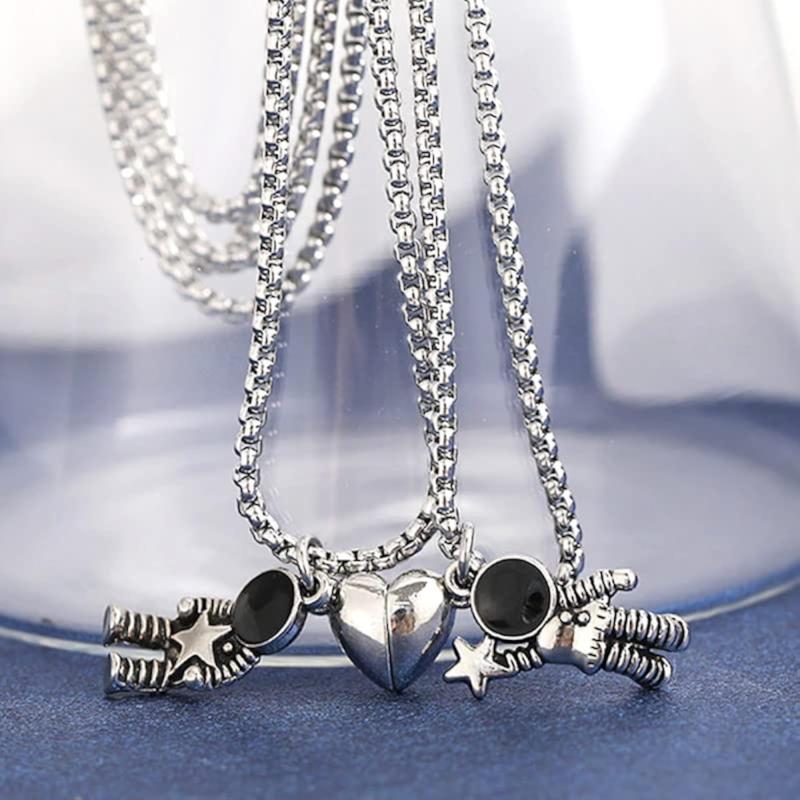 This astronaut-themed couple pendant set features heart-shaped pendants with a moon and back design. A perfect gift for space and love enthusiasts.