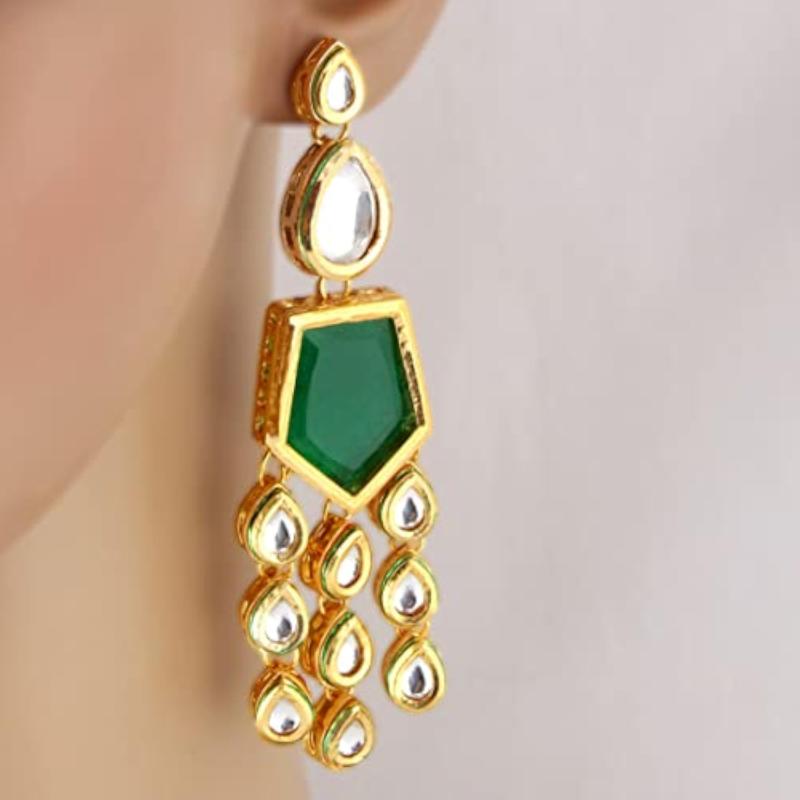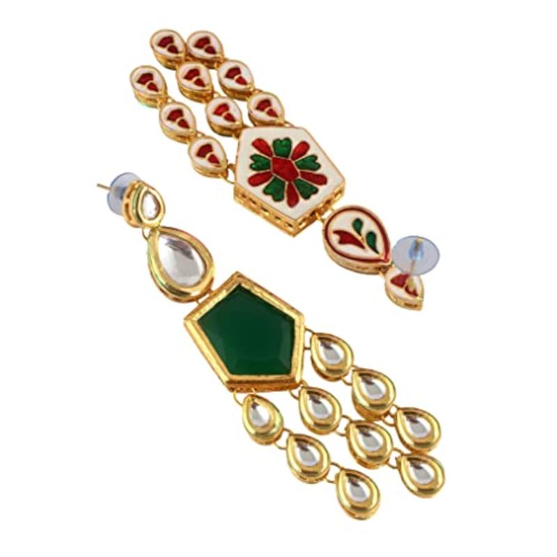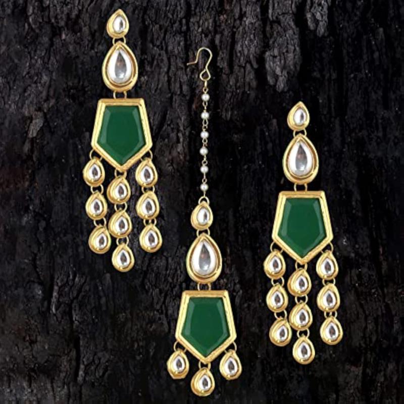 Exquisite set of traditional back Meena 18k plated uncut kundan tika earrings for women.