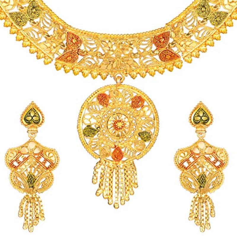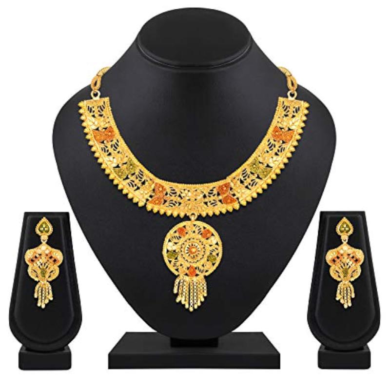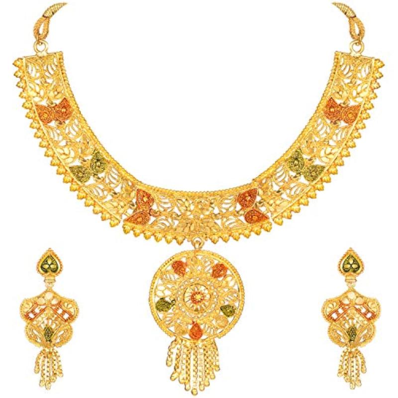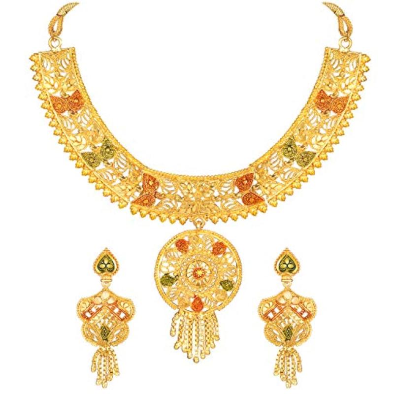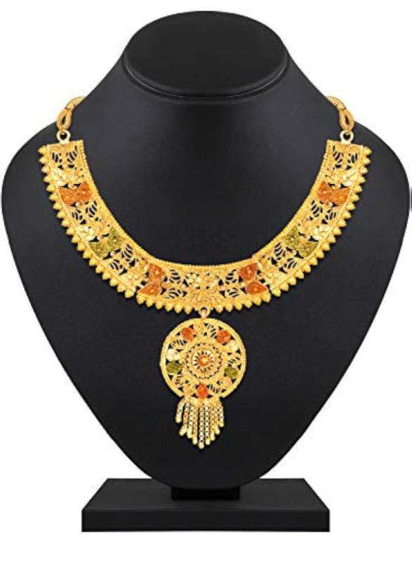 Elegant choker necklace set with traditional designs, plated in gold for a luxurious look.