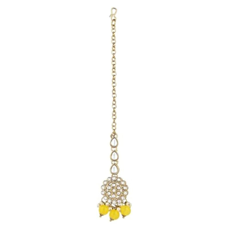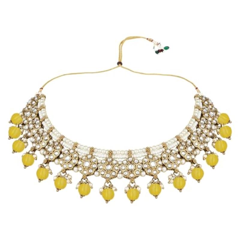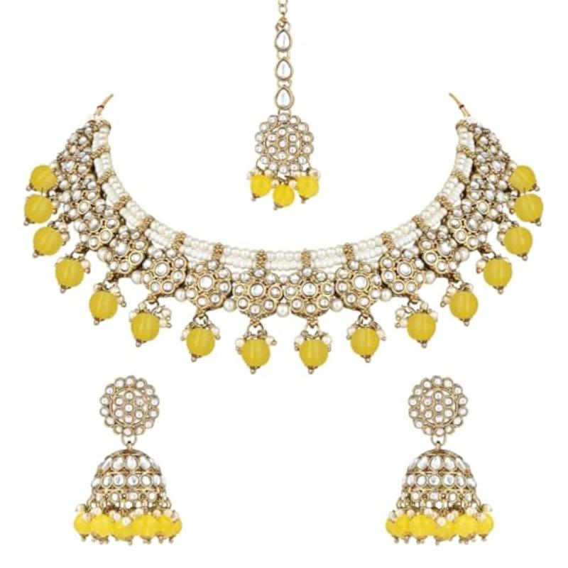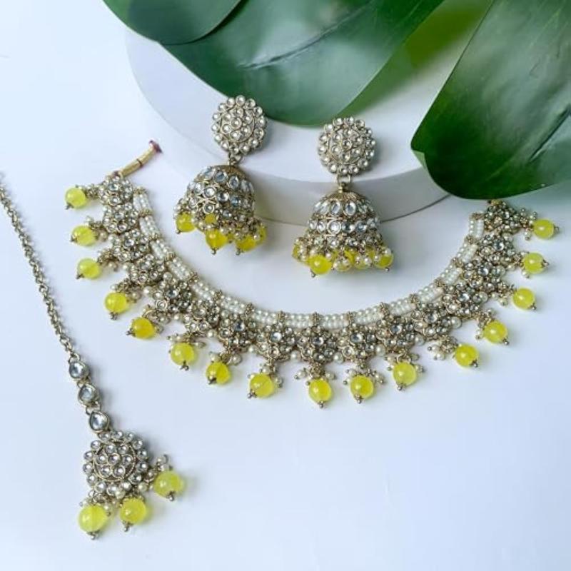 Elegant Kundan choker set with matching earrings and maang tikka for a sophisticated look.