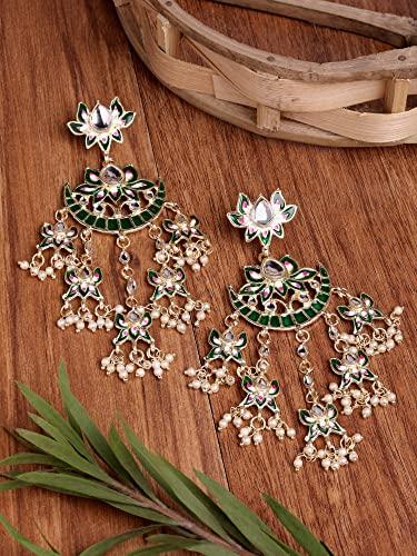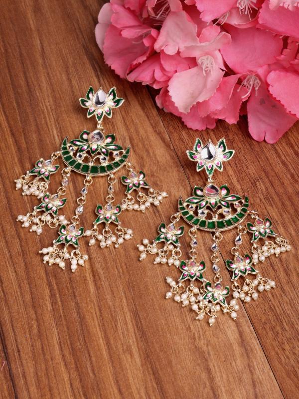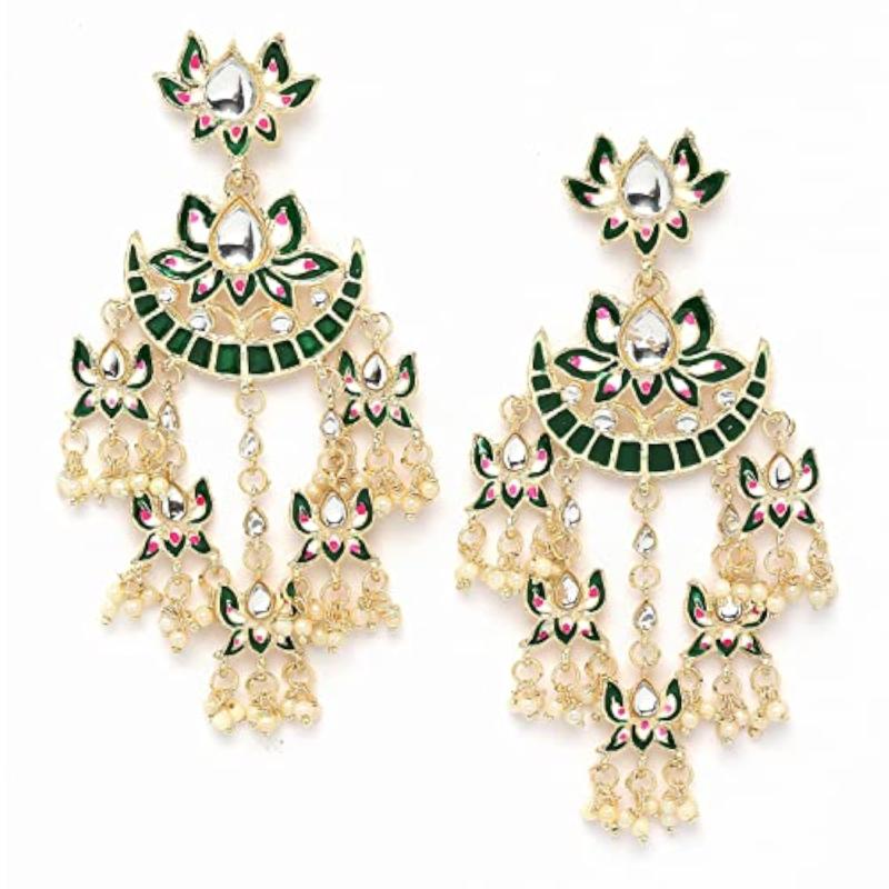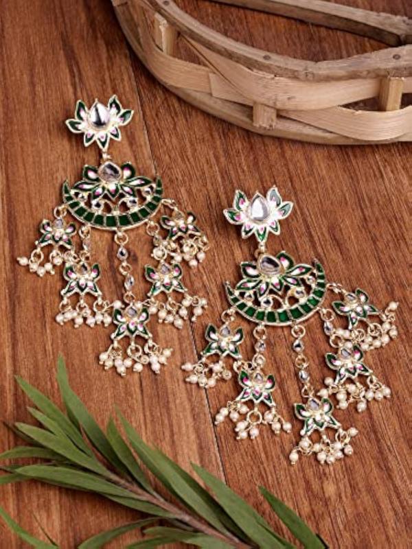 Add a touch of elegance to your look with these stunning traditional Kundan earrings. The vibrant green color adds a pop of color to any outfit.