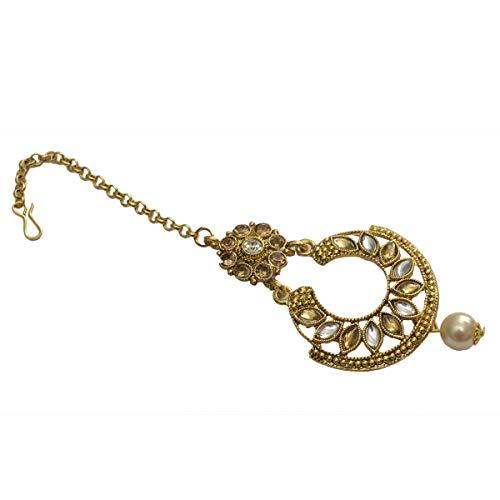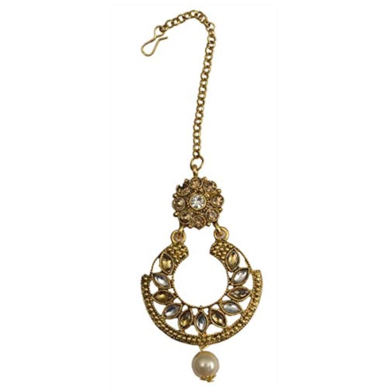 This Indian ethnic maang tikka is a must-have accessory for weddings and festive occasions. It features intricate design work and is plated with silver for a traditional look.