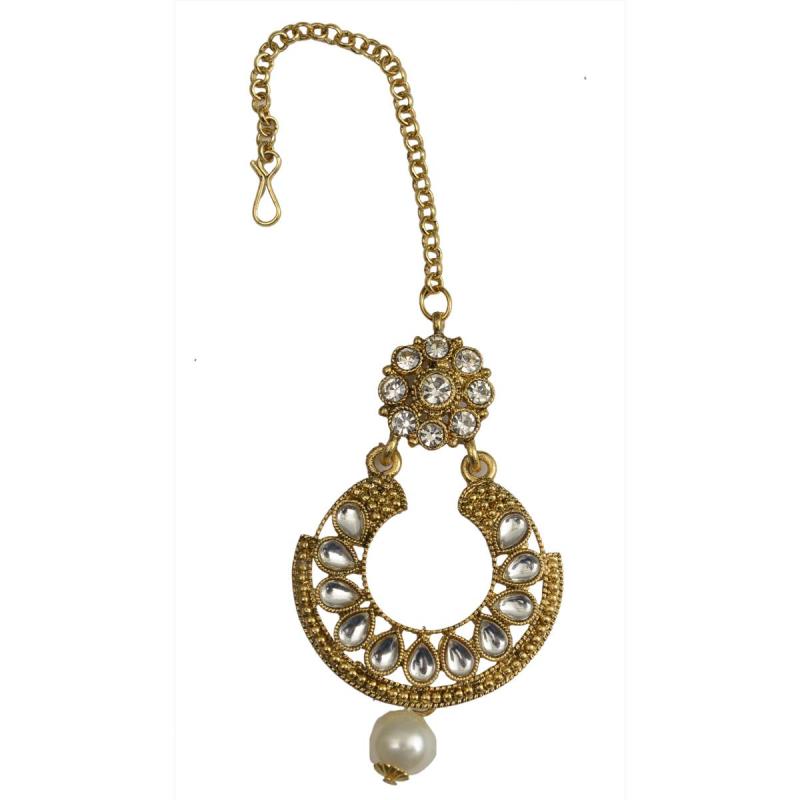 Elegant maang tikka headpiece with intricate design, perfect for traditional occasions.