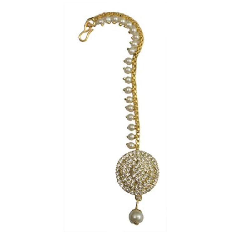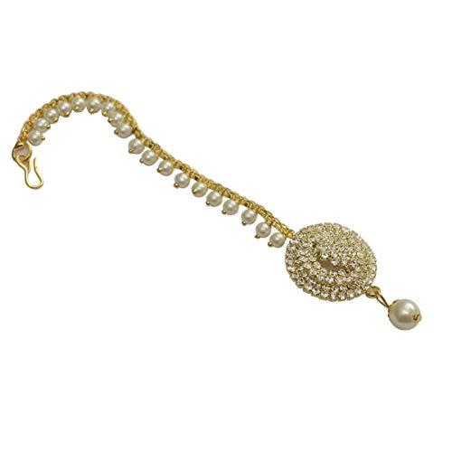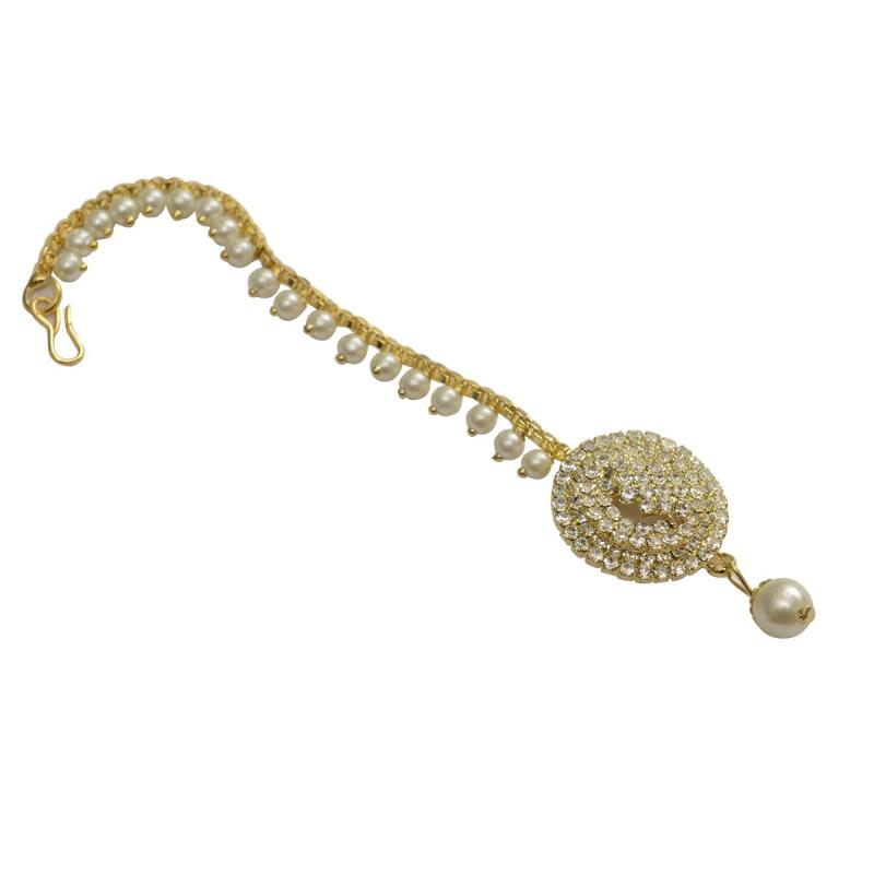 Elegant maang tikka adorned with kundan and pearl embellishments for a classic look.