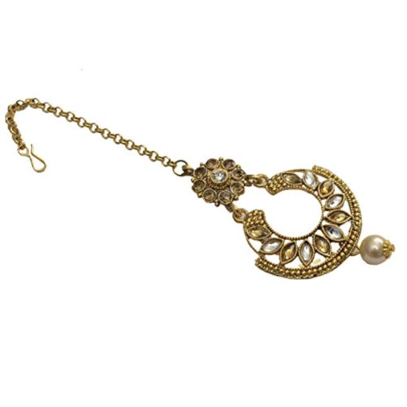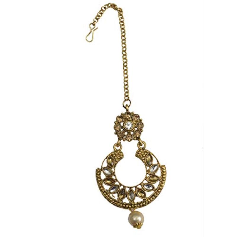 Elegant maang tikka featuring intricate kundan and pearl detailing for a traditional look.