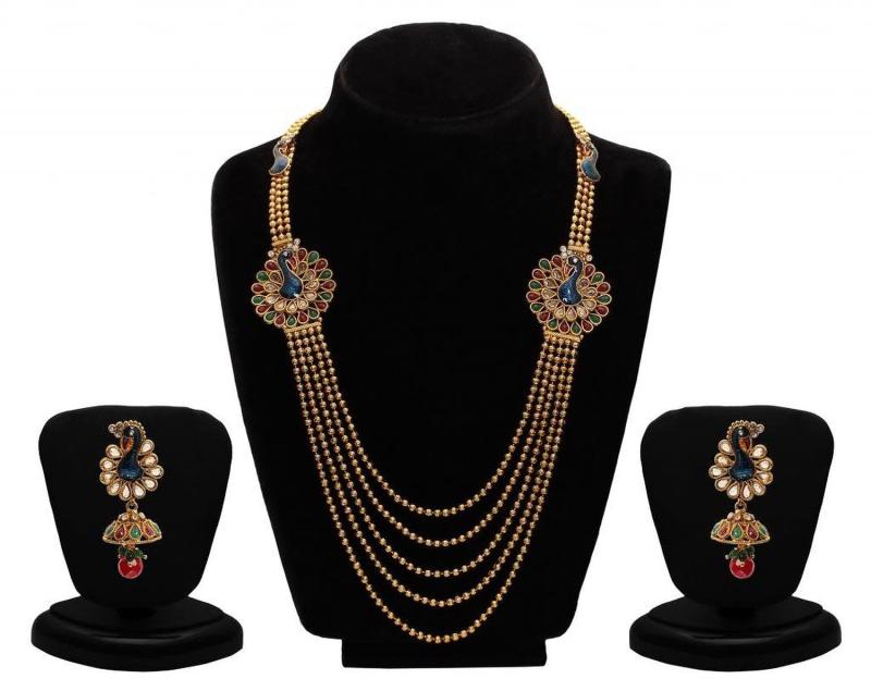 This exquisite Dancing Peacock necklace set is a perfect choice for special occasions like Rakhi. The intricate design and vibrant colors make it a stunning addition to your jewelry collection.
