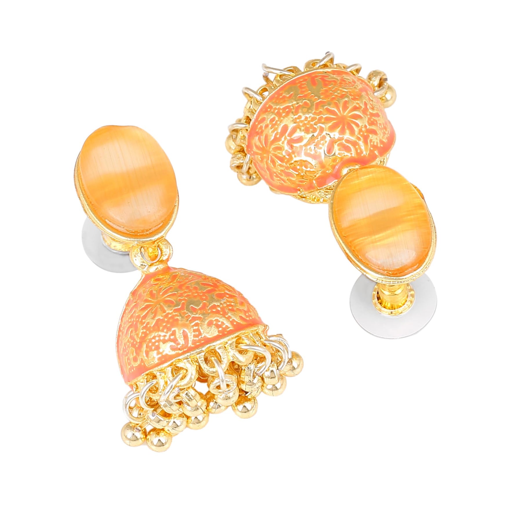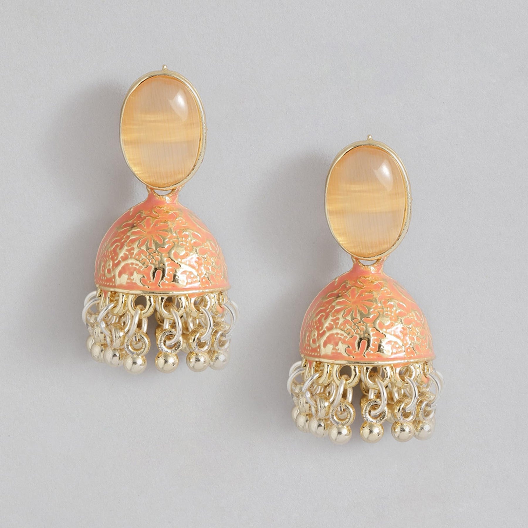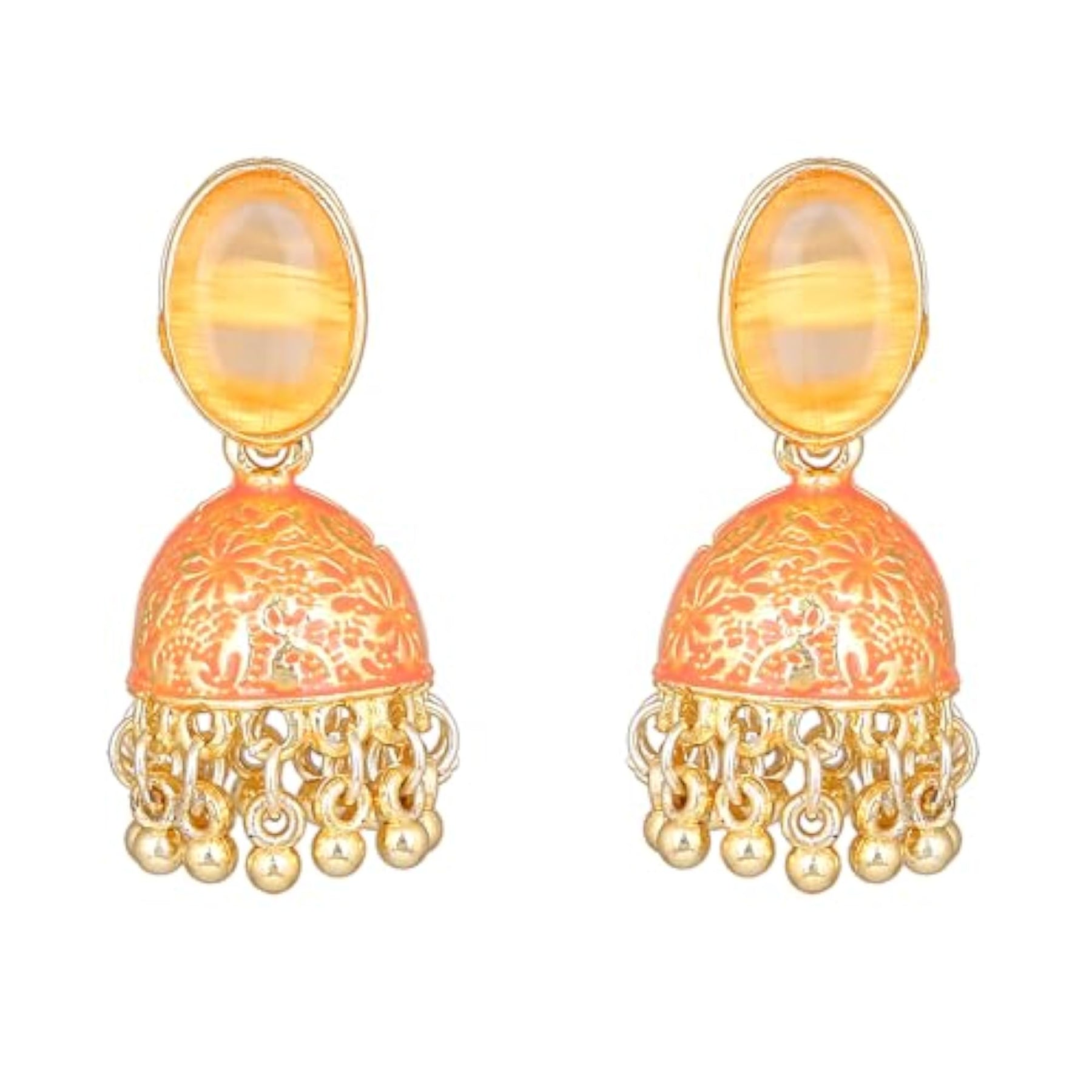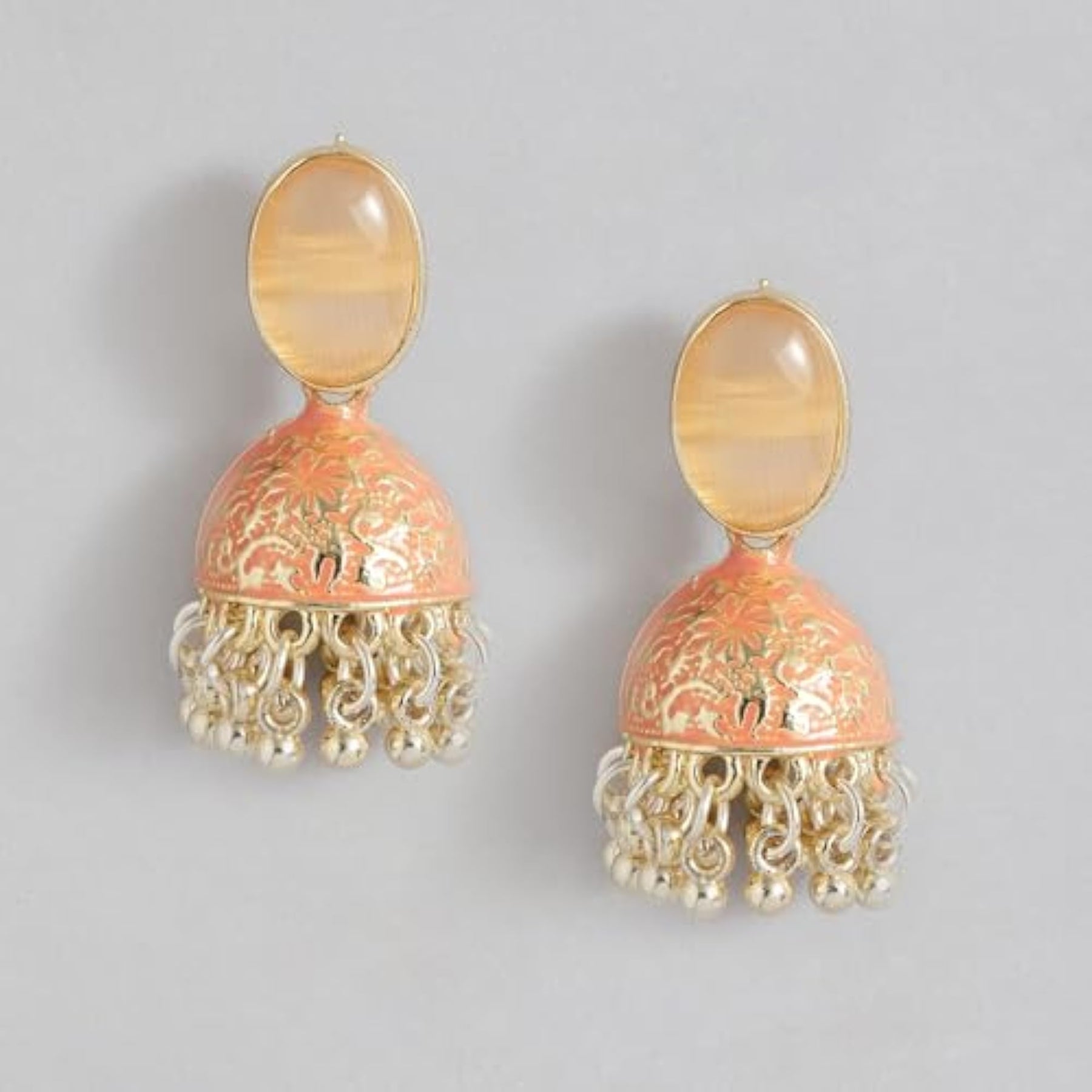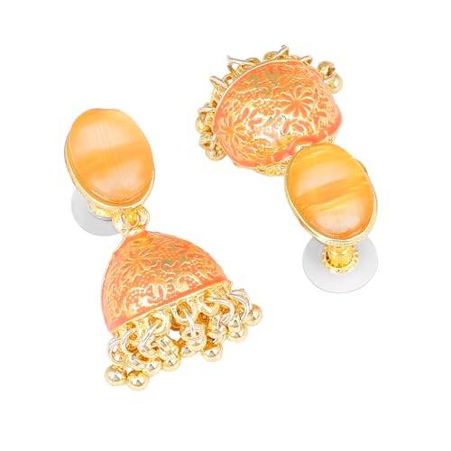 These stunning jhumka earrings feature intricate Meenakari work with colorful enamel. Perfect for adding a touch of traditional charm to any outfit.