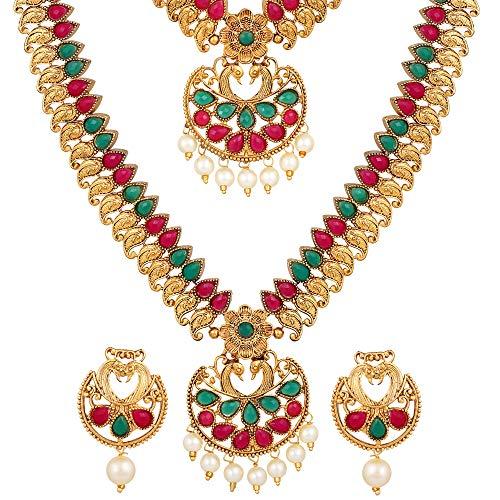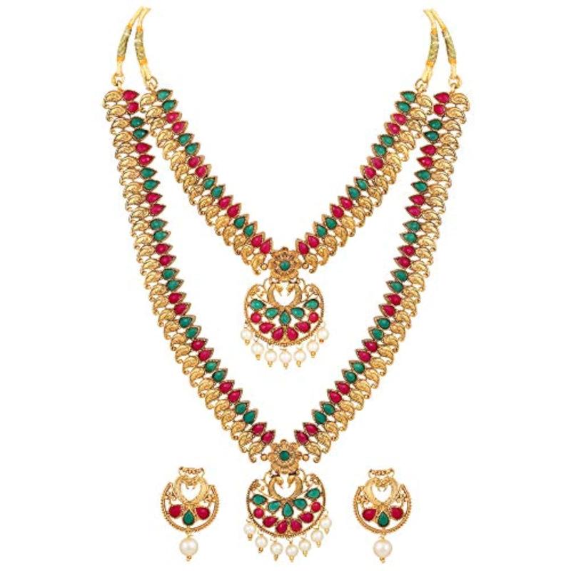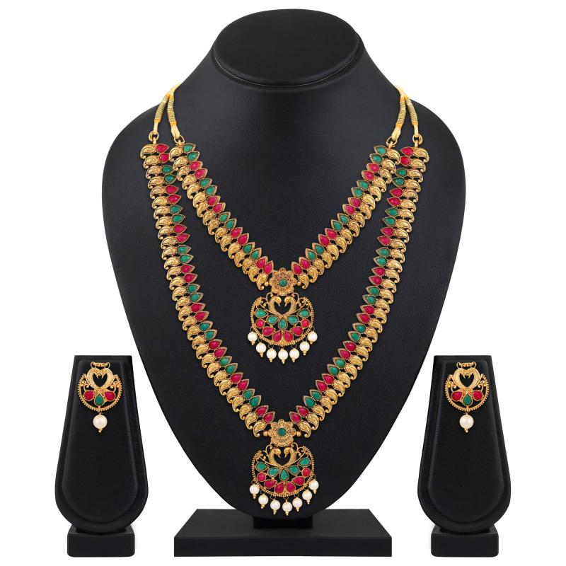 Exquisite plated jewellery set comprising necklace and earrings. Ideal for traditional occasions.