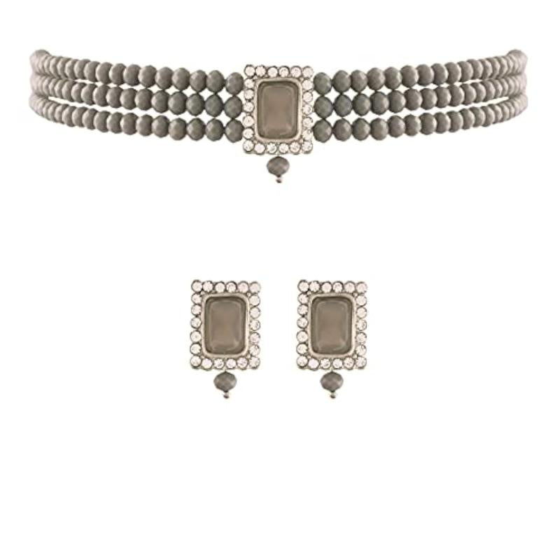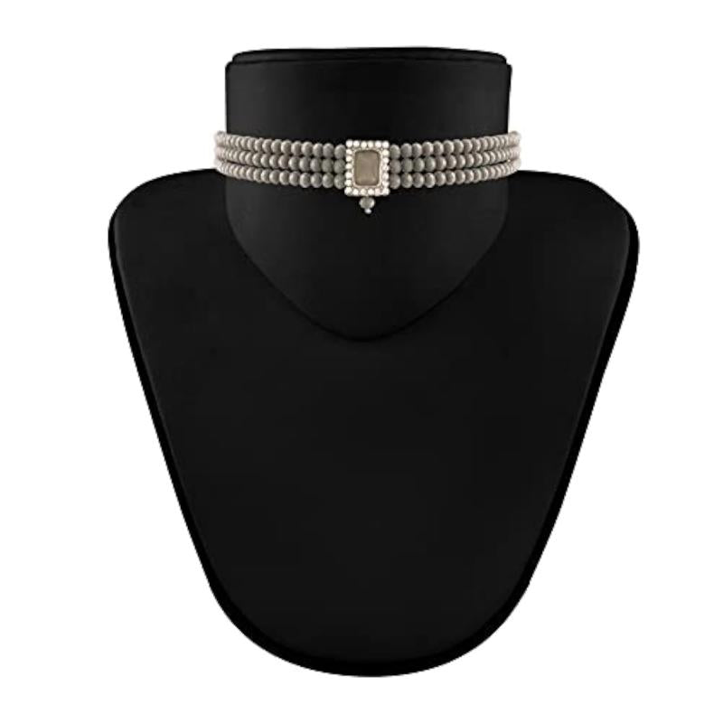 Elegant choker necklace set featuring silver plated design with traditional stone and pearl accents.