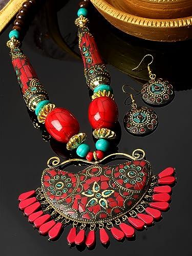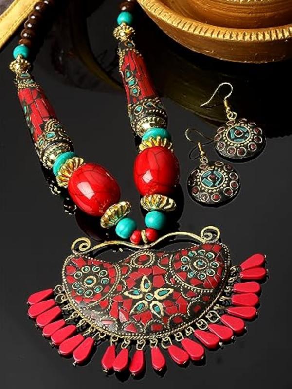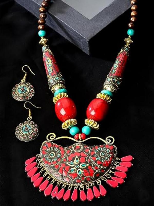 This pendant necklace set is a stylish interpretation of traditional Tibetan design. The oxidised finish adds a touch of rustic charm, making it a unique and versatile accessory.