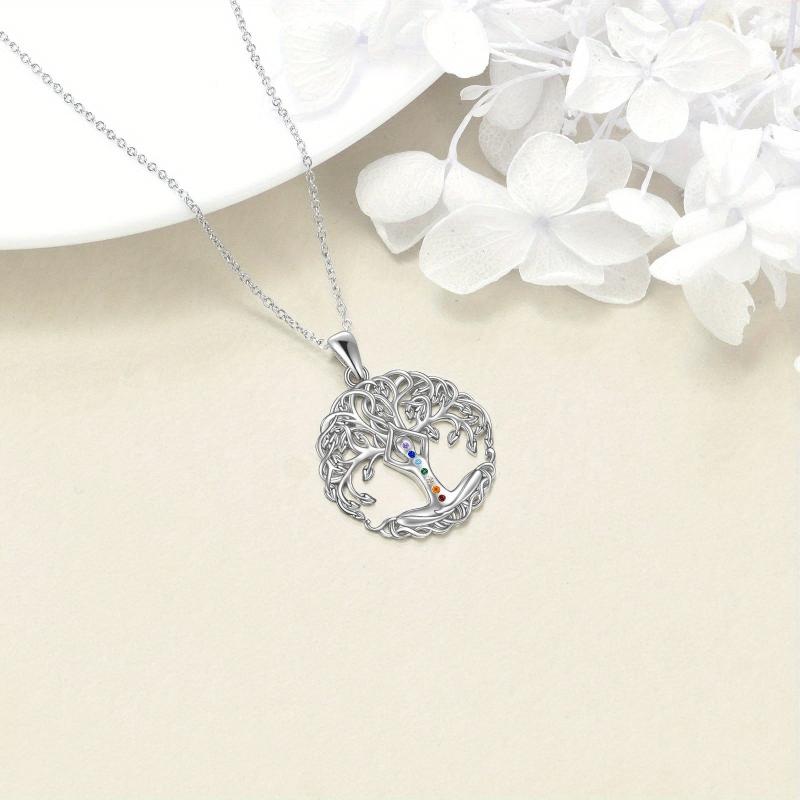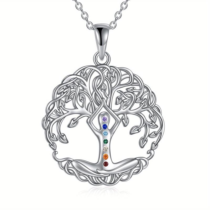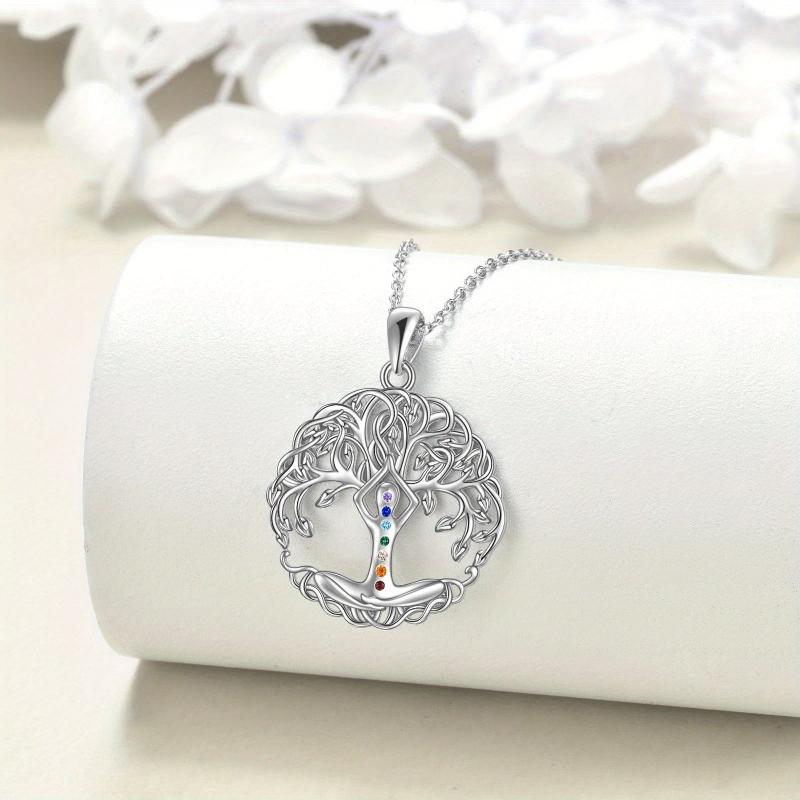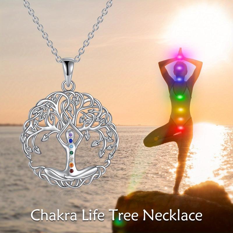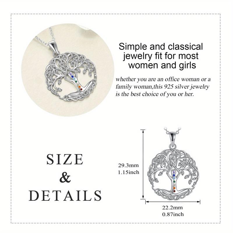 Elevate your style with this stunning 925 sterling silver necklace featuring a Tree of Life design with chakra and angel accents. This crystal pendant jewelry is a spiritual and elegant addition to any outfit.