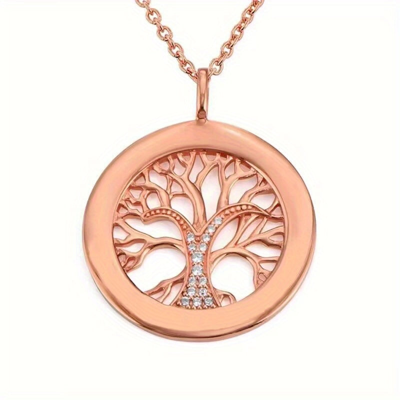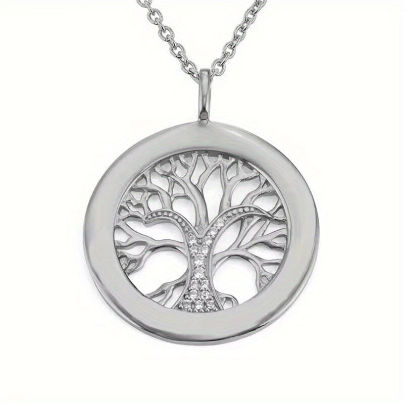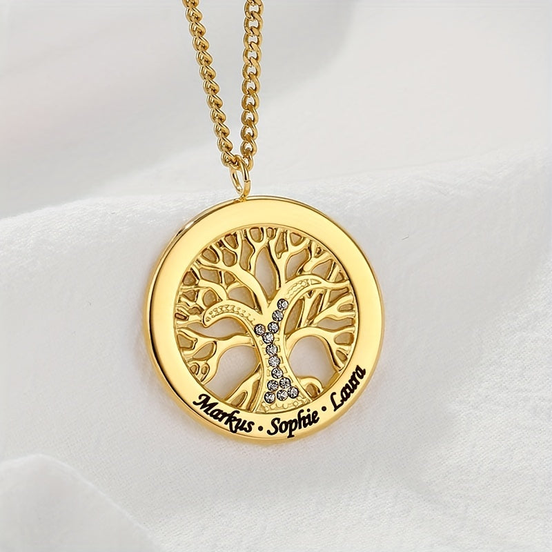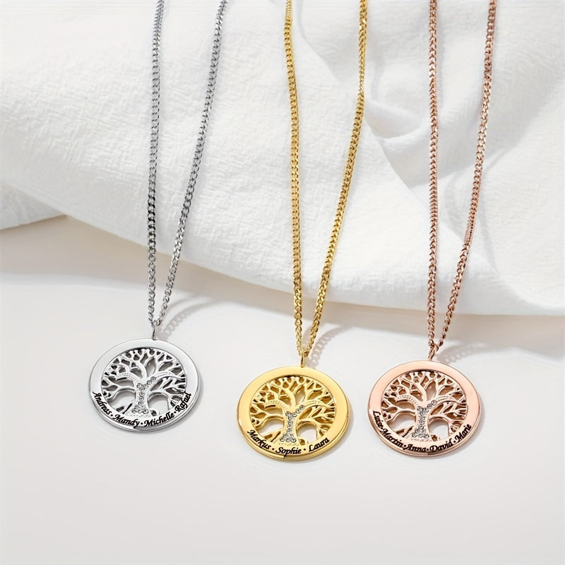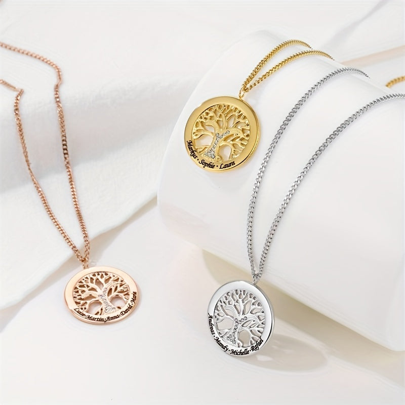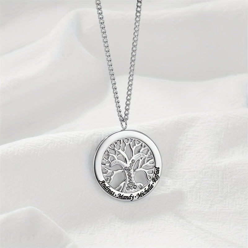 Beautiful zircon name plaque necklace with a tree of life design. Personalized and crafted from stainless steel for a lasting gift.