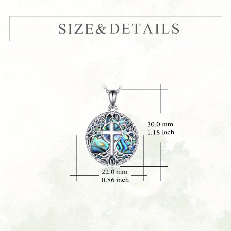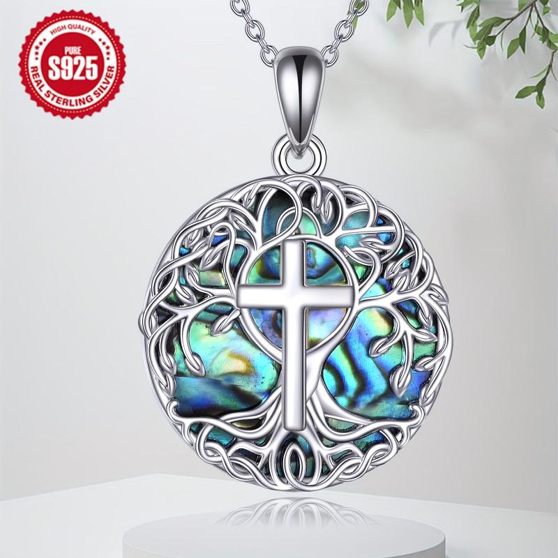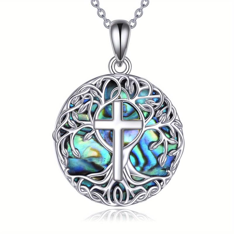 This Tree of Life necklace features a sterling silver cross pendant with beautiful abalone shell inlay. A symbol of faith and spirituality, this Celtic-inspired piece is perfect for religious jewelry lovers.