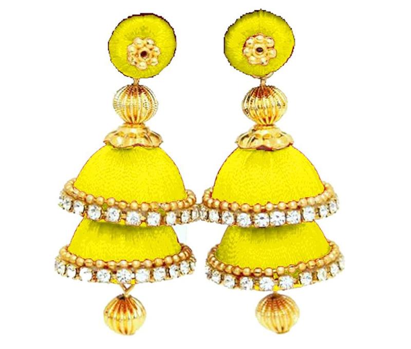 Elegant and stylish double decker silk jhumkas earrings that add a touch of sophistication to your outfit.