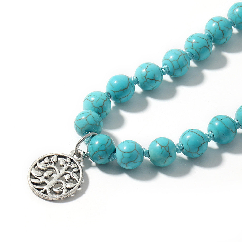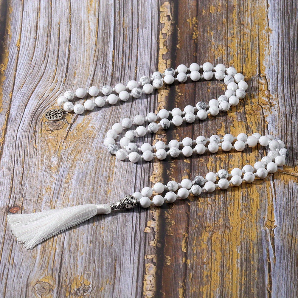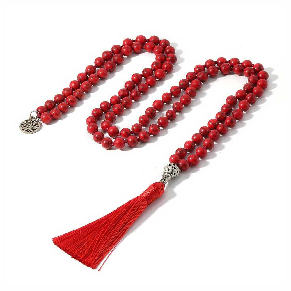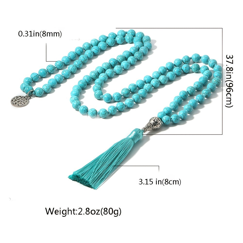 This beautiful necklace features turquoise beads knotted together with a tassel, perfect for meditation, yoga, or prayer.