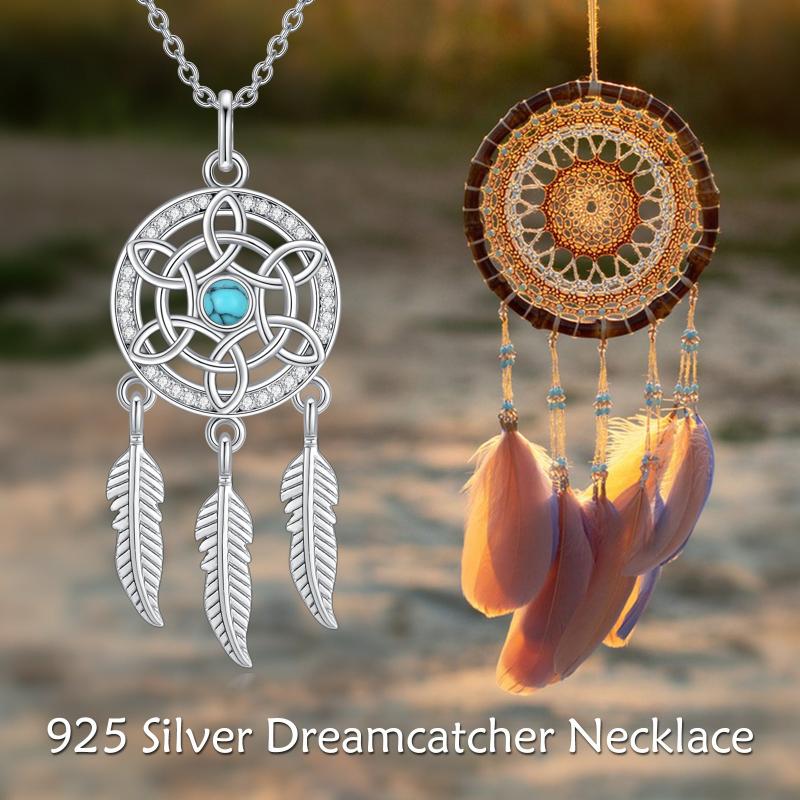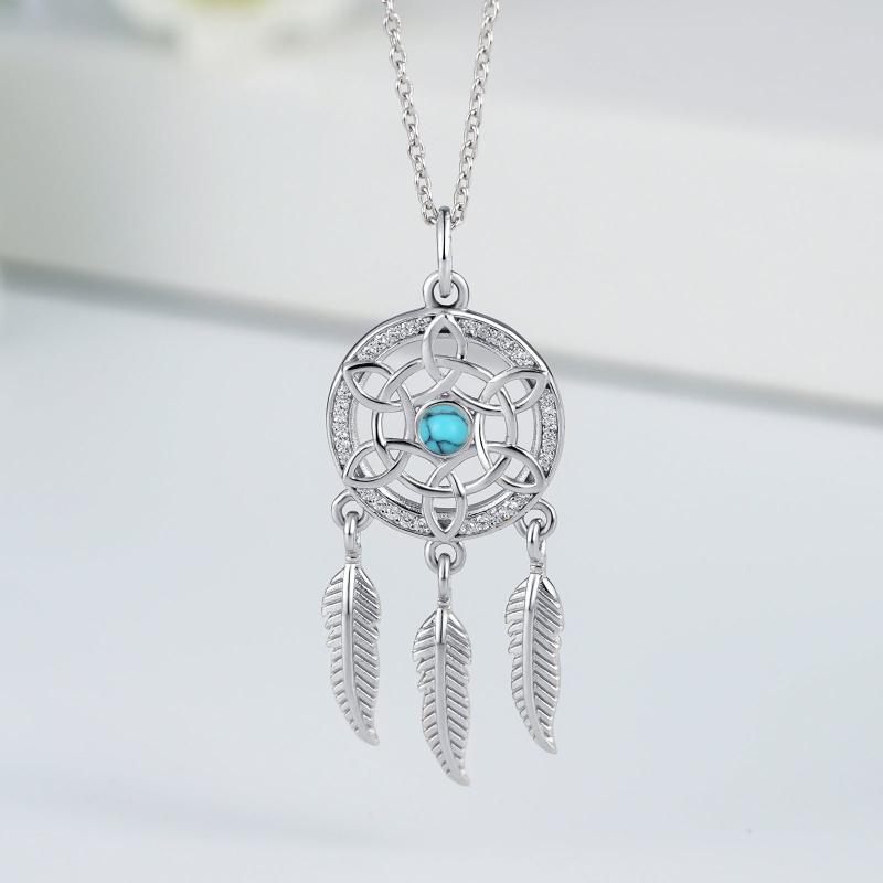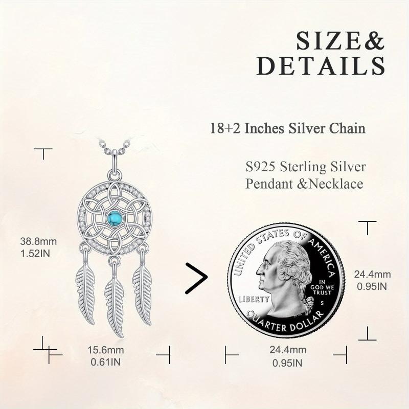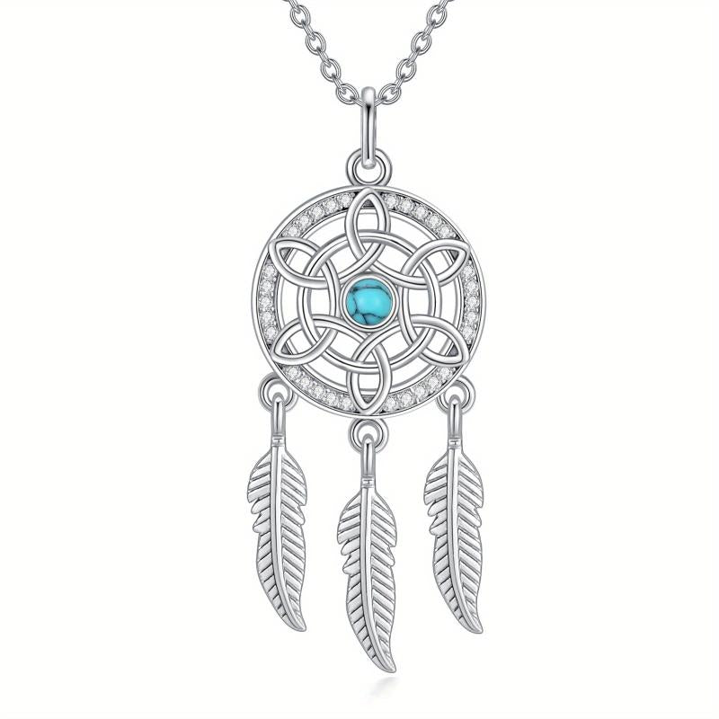 This beautiful necklace features a turquoise dream catcher pendant with intricate feather detailing. It is made of 925 sterling silver and is perfect for adding a bohemian touch to any outfit. A great gift for women who love unique jewelry.