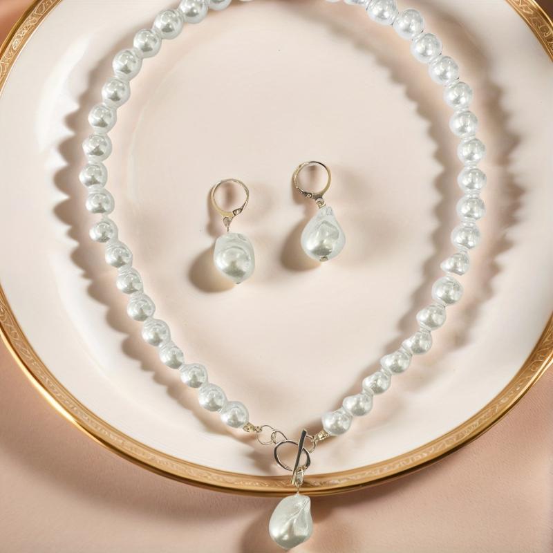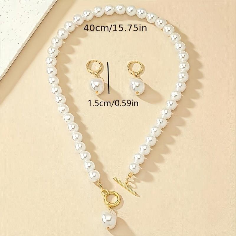 Complete your look with this elegant set featuring a round artificial pearl bead necklace and matching earrings. The OT buckle baroque pearl pendant adds a touch of sophistication to your outfit.