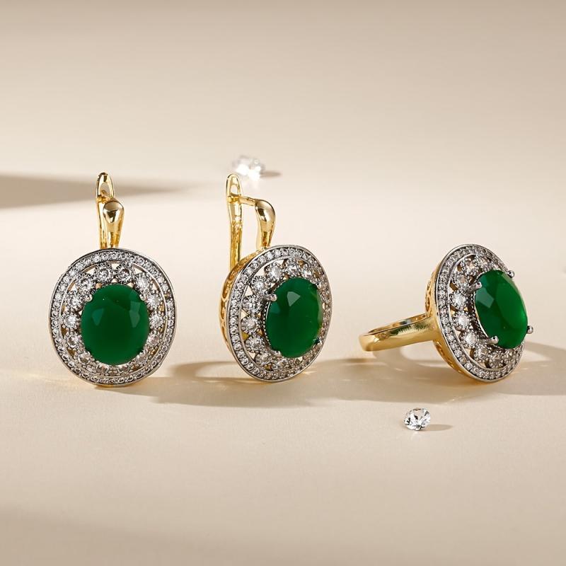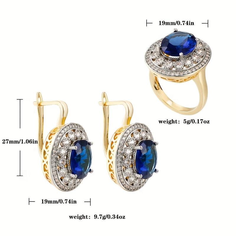 Complete your party look with this stunning two-tone oval inlaid synthetic zirconia earrings and ring set. The set is 14K golden plated, making it perfect for a party or banquet.