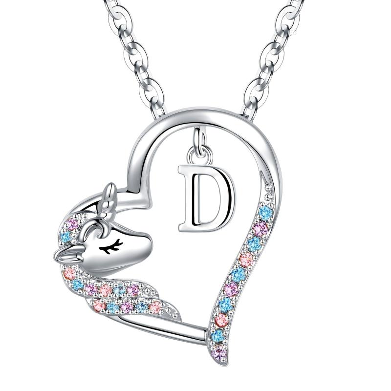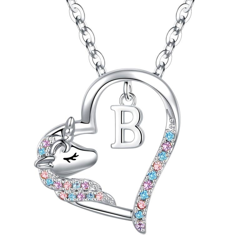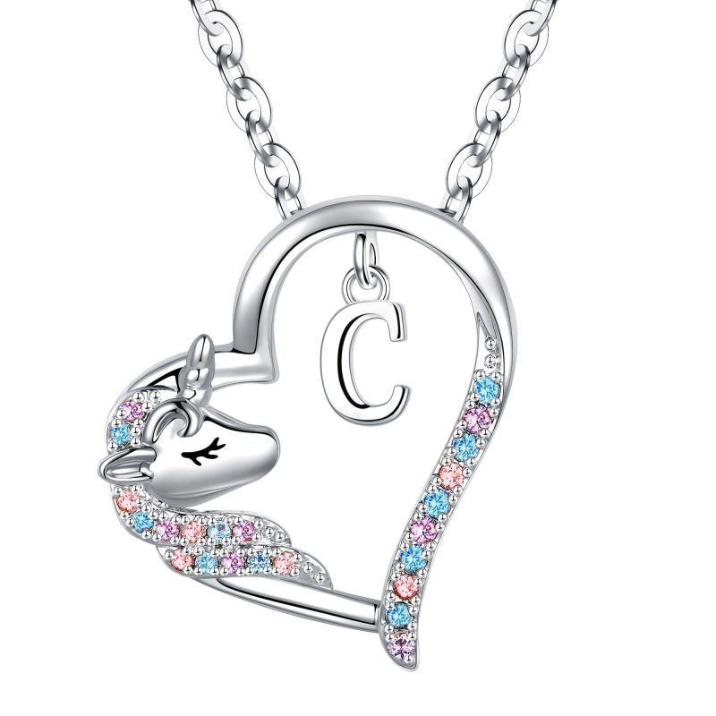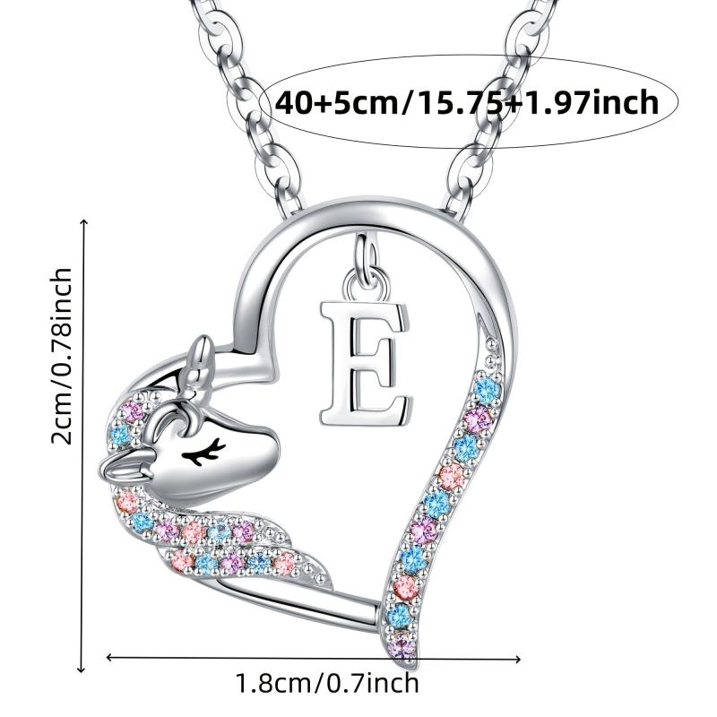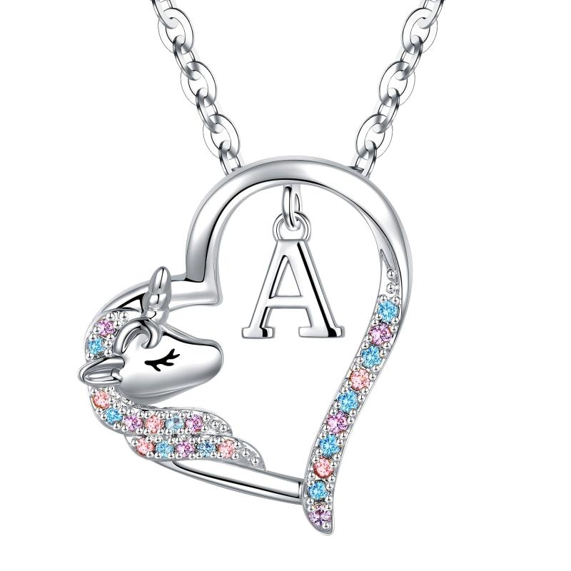 This unicorn heart pendant necklace features colorful cubic zirconia and a personalized initial A. Made of copper, it is ideal for daily wear or special occasions. Perfect Valentine's Day gift.