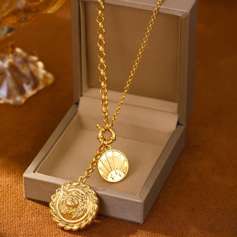 Elevate your streetwear style with this unisex dual pendant necklace featuring interlocking circle and lion pendants in a trendy golden tone. Perfect for adding a bold touch to any outfit.