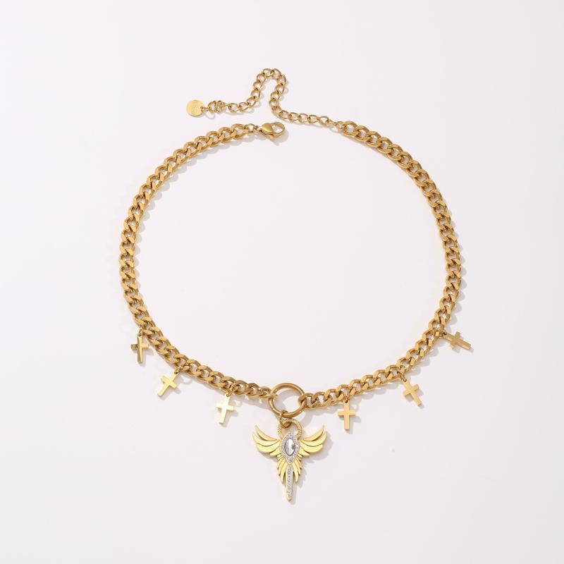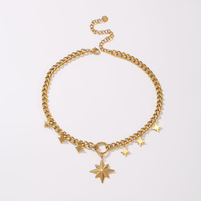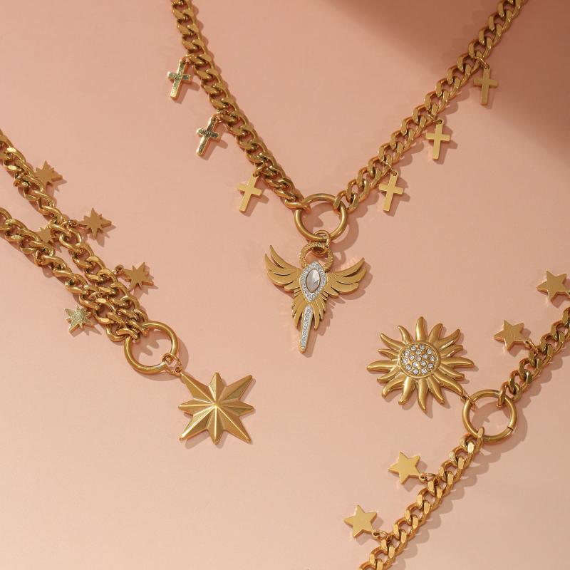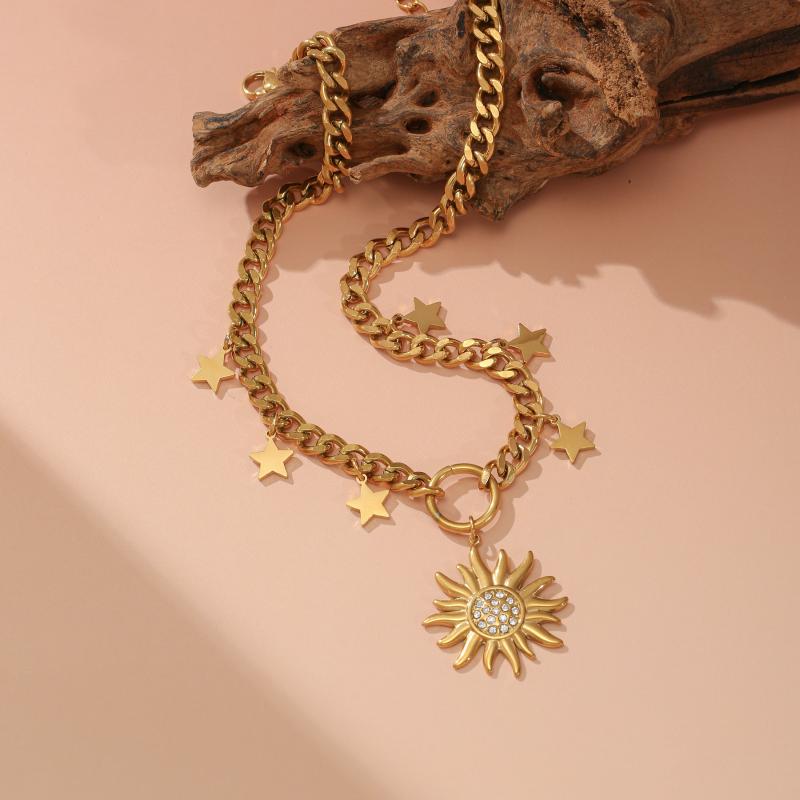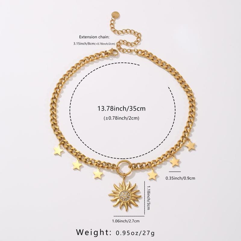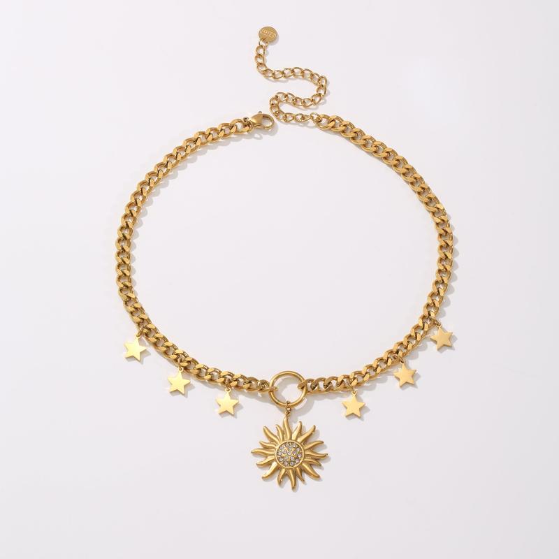 This stainless steel necklace is perfect for beach holidays and everyday wear. It features sun and star charms with synthetic zirconia embellishments.