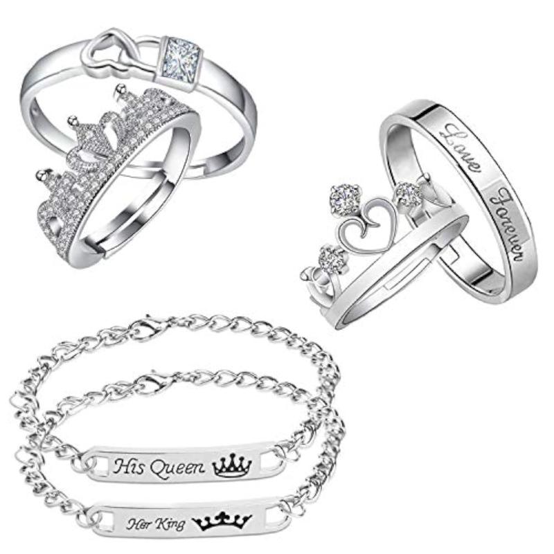Celebrate your love with this Valentine's combo featuring a His Queen Her King bracelet and couple rings. Perfect gift for your significant other.