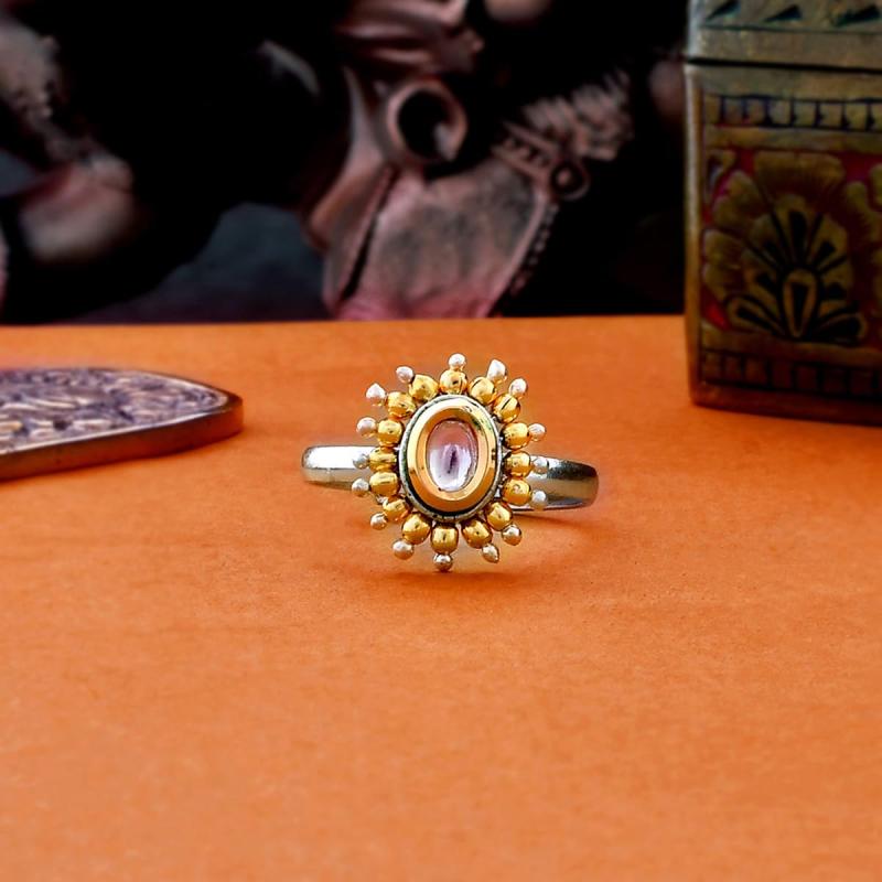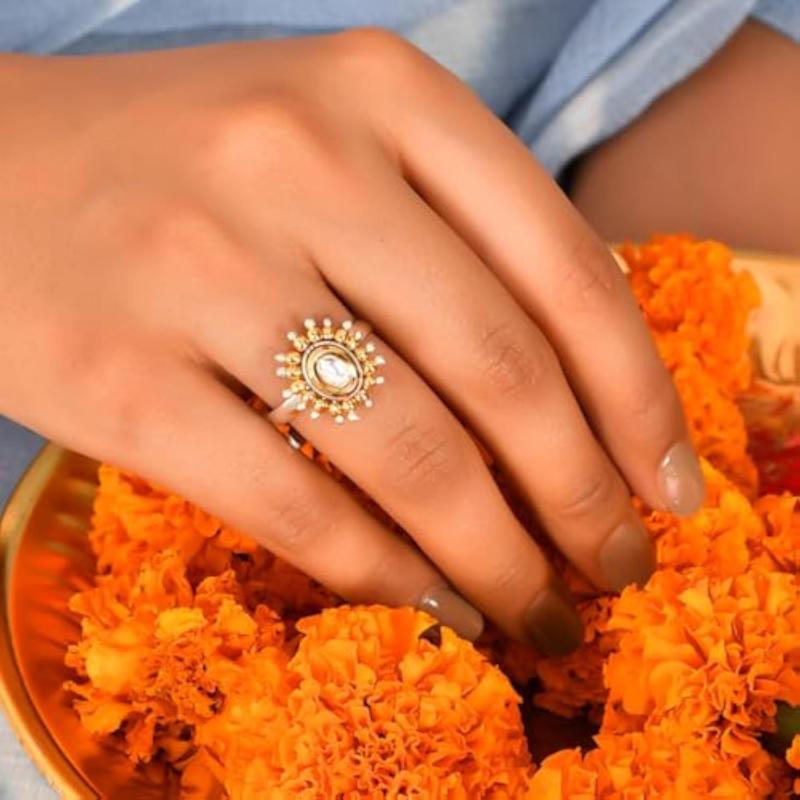 Make a bold statement with this exquisite Veerangana ring featuring pearls and kundan stones. Perfect accessory for special occasions.
