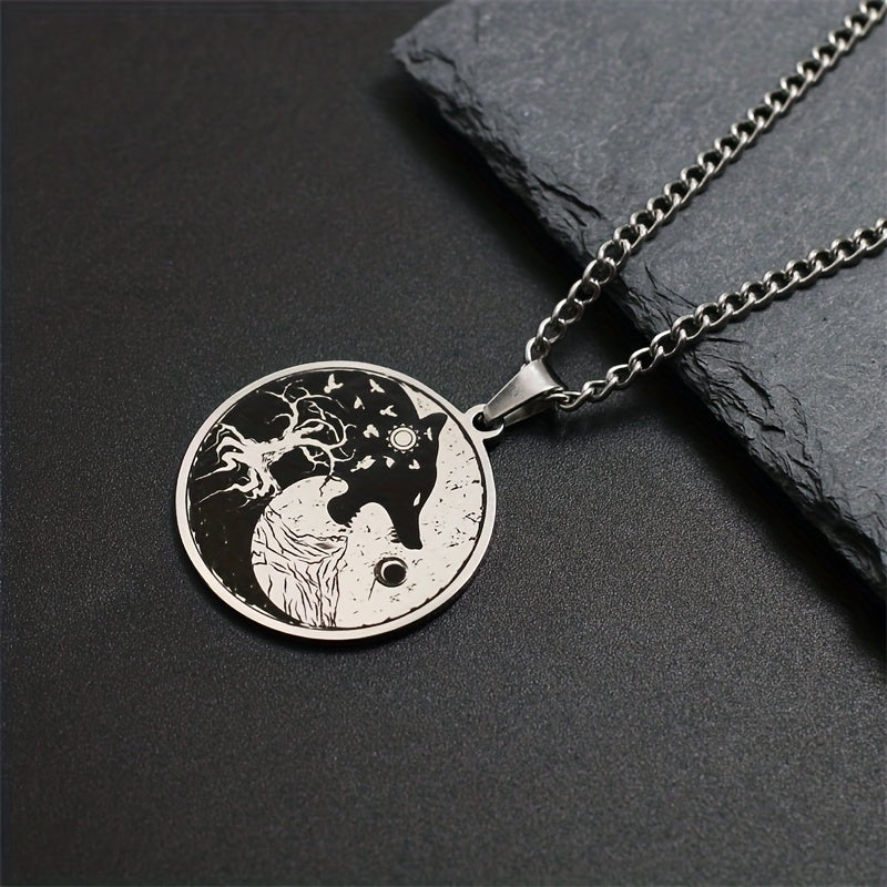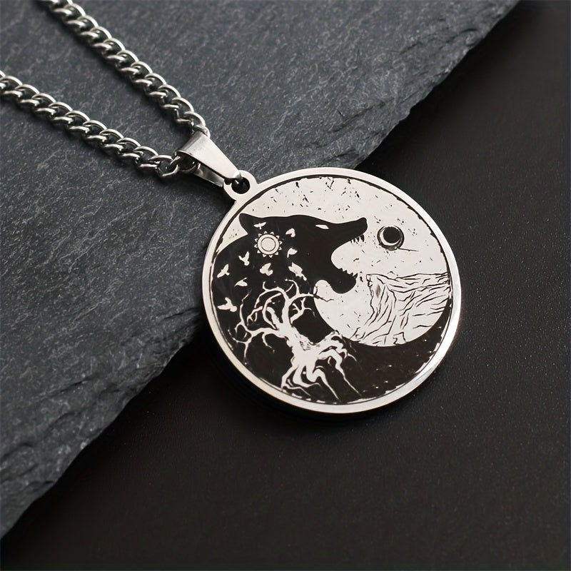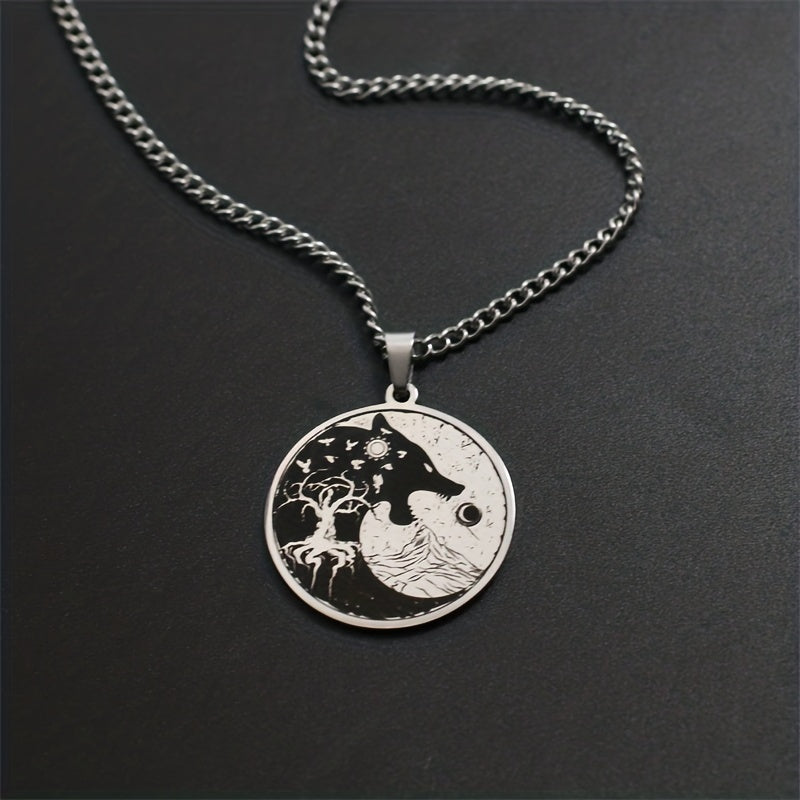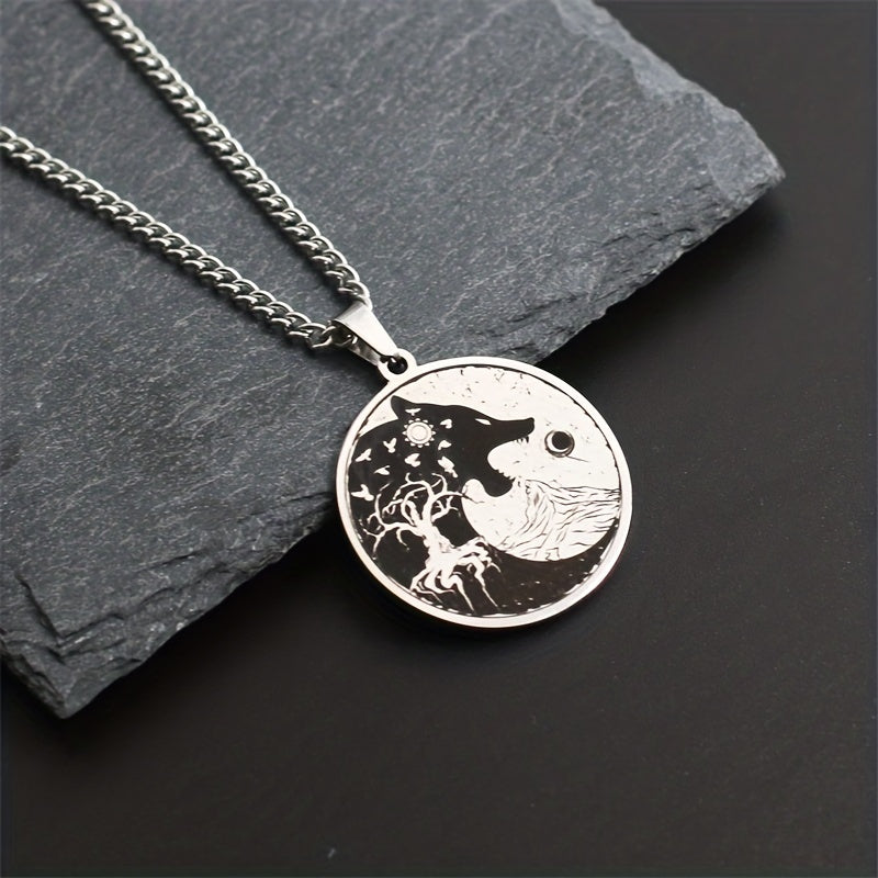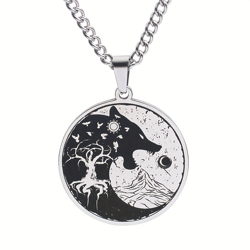 This Viking necklace features a striking design with symbols like the Sun, Moon, Wolf Head, Mountain, and Tree of Life. Made of durable stainless steel, this pendant necklace is a great gift for men.