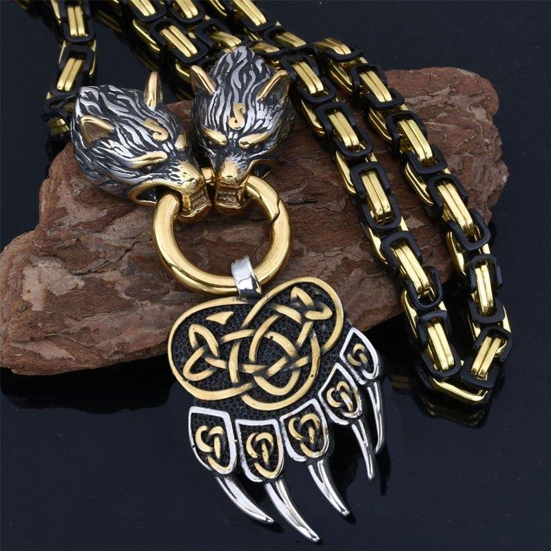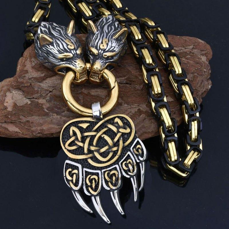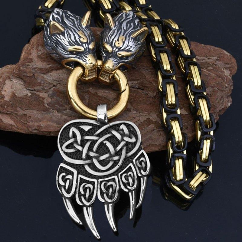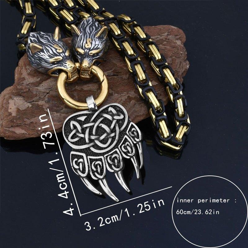 Enhance your style with this Norse-inspired bear claw necklace featuring Viking wolf head pendant. Crafted from stainless steel, this versatile piece exudes a unique Nordic Norwegian flair.
