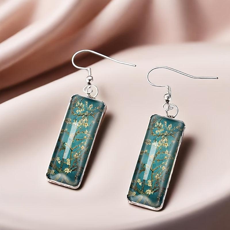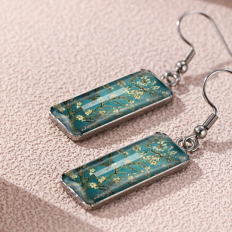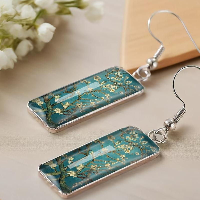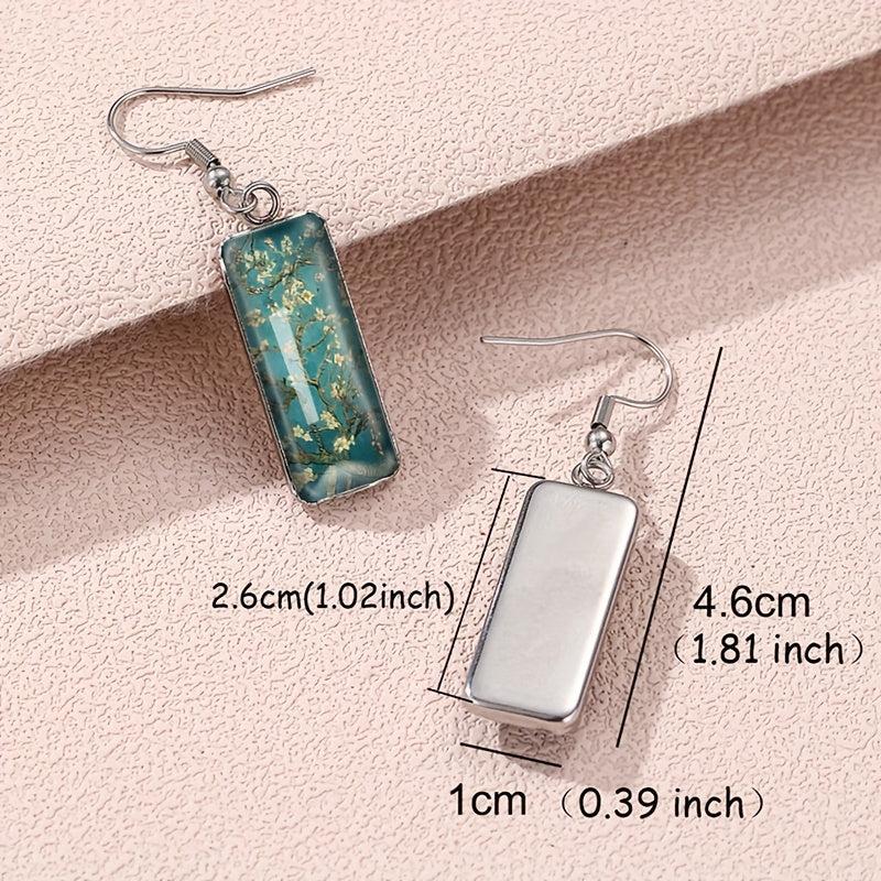 These rectangular hook pendant earrings feature a vintage blooming apricot blossom painting design. They are a unique piece of men's jewelry that adds a touch of sophistication to any outfit.