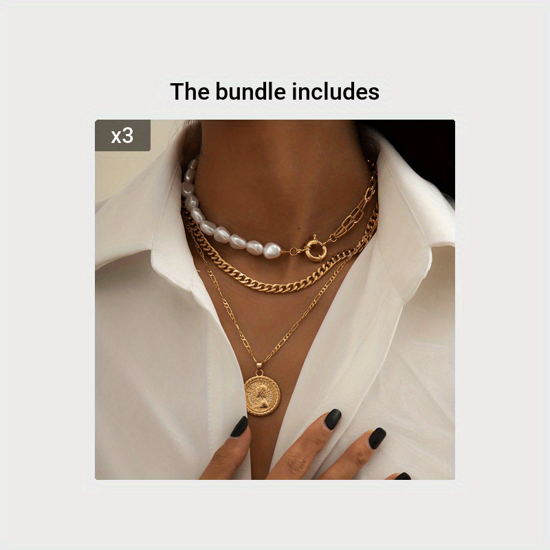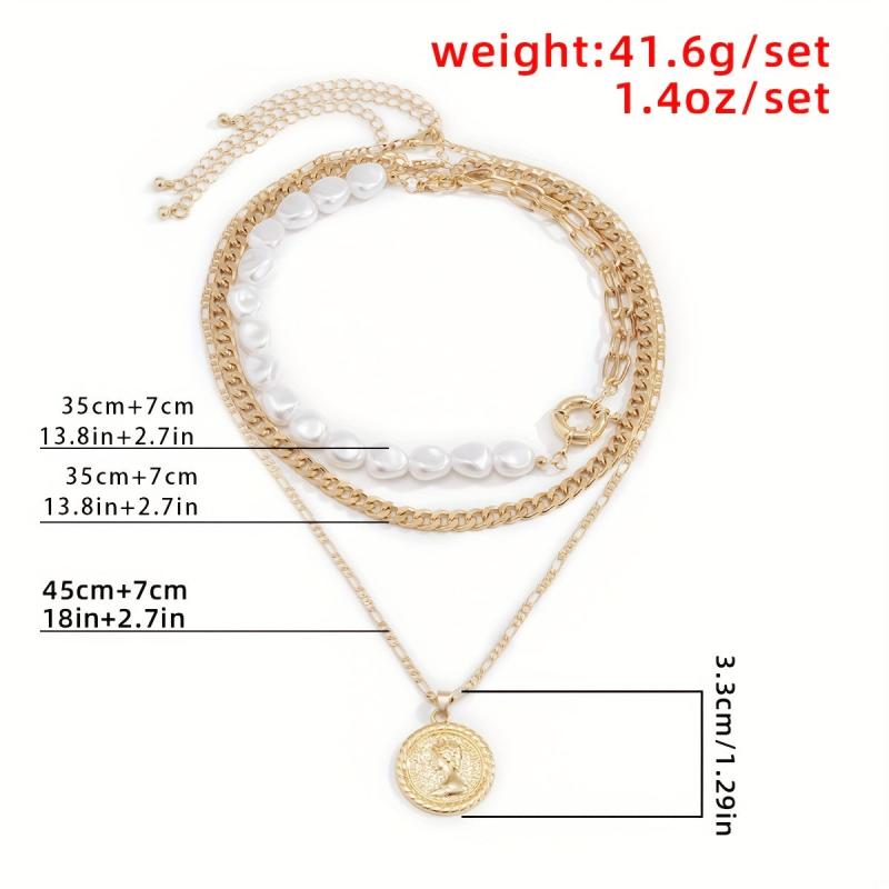 Elegant and stylish necklace set featuring faux pearl and metal pendants in a baroque design. Perfect for adding a touch of vintage charm to any outfit.
