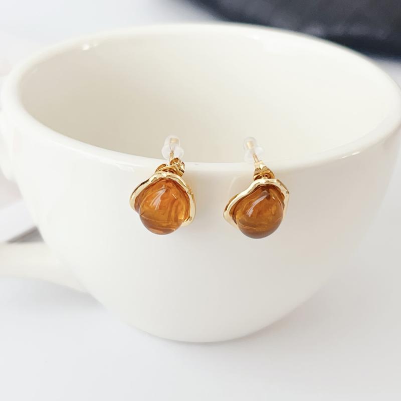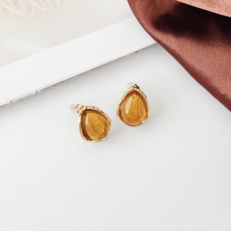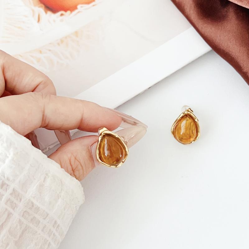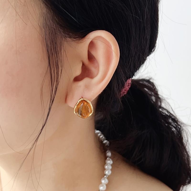 Elegant vintage bohemian stainless steel earrings with amber resin oval studs and golden tone accents. Hypoallergenic and dainty golden plated jewelry for women.
