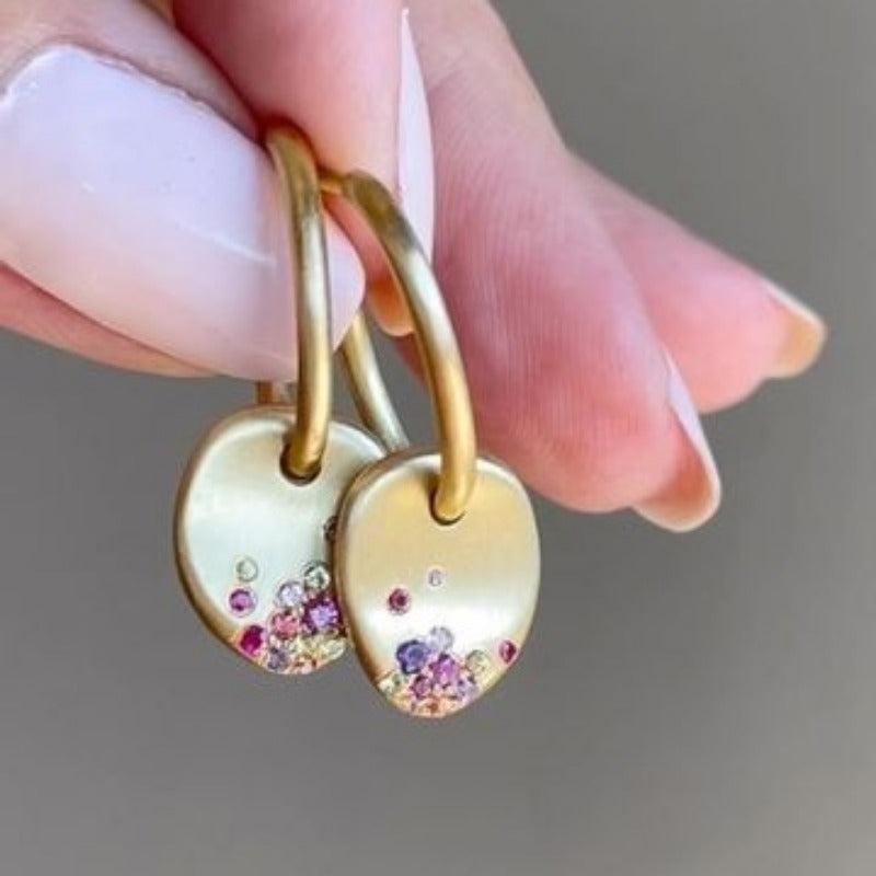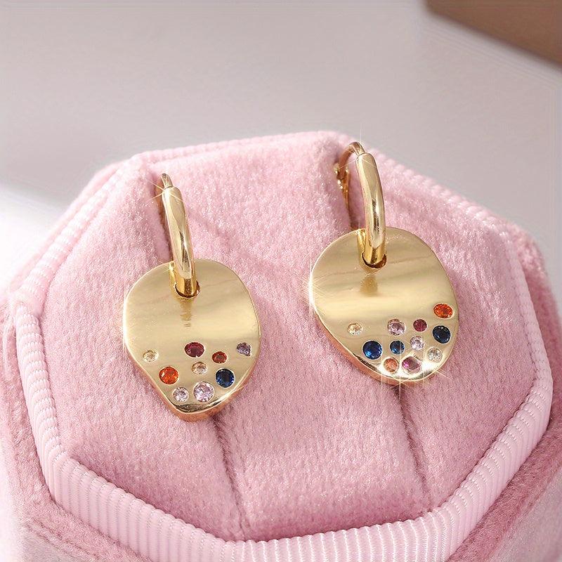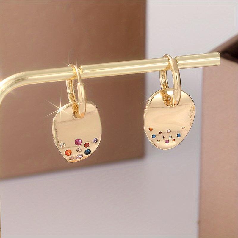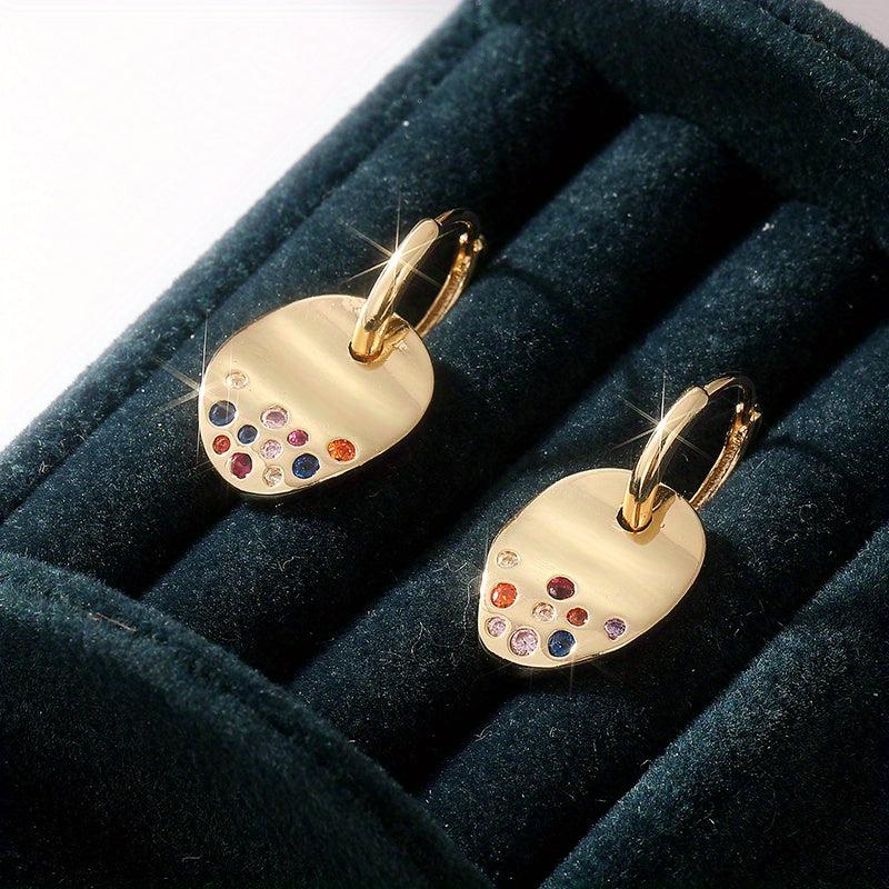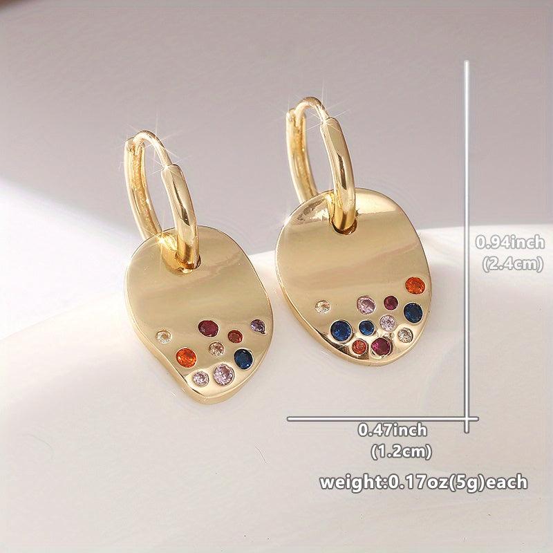 Golden plated copper earrings with colorful synthetic zirconia stones. Compact and lightweight design suitable for everyday wear and special occasions.