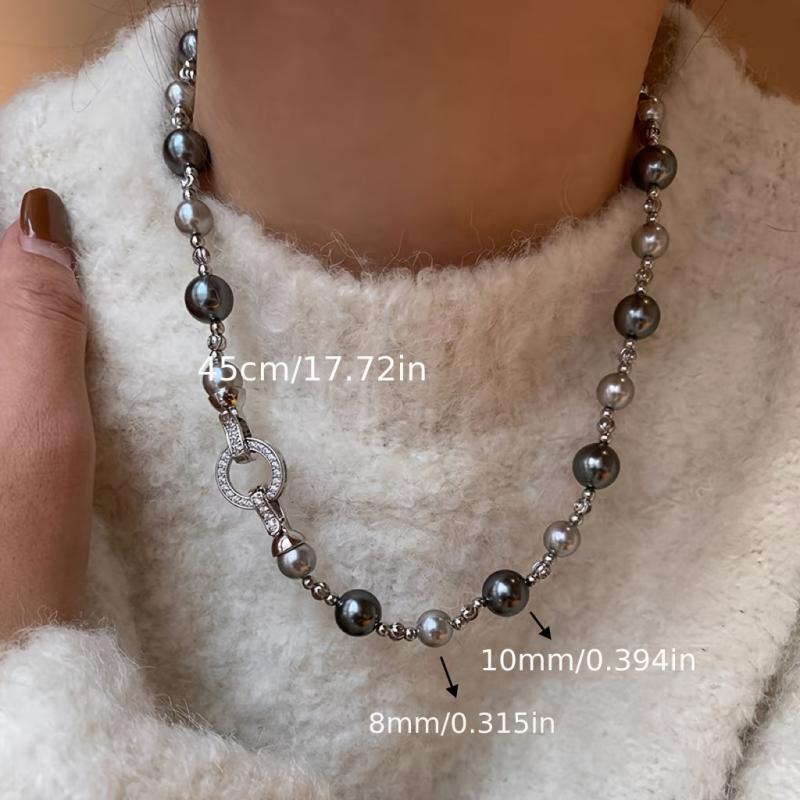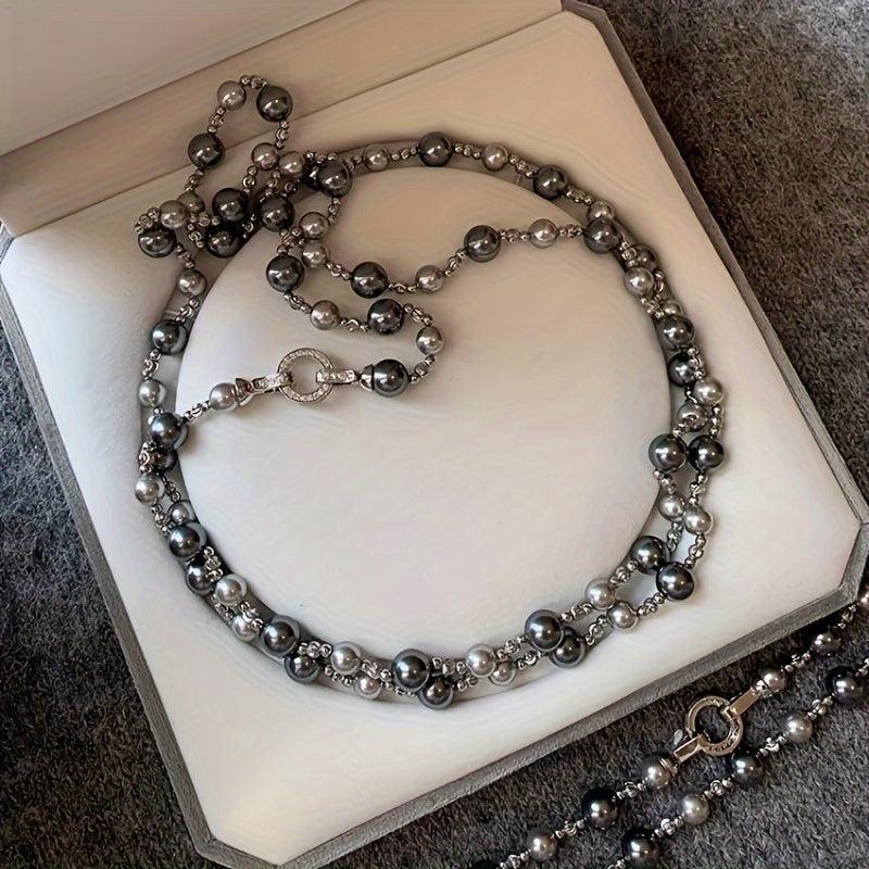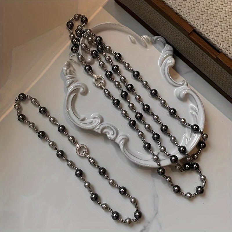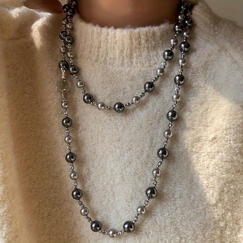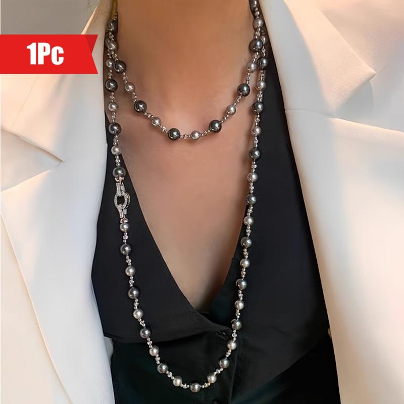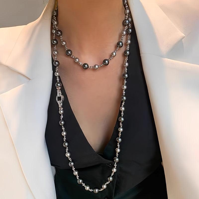 Elegant and stylish long pearl necklace featuring two-tone and grey synthetic pearls, perfect for adding a touch of vintage charm to your outfit. Ideal for those born in April.