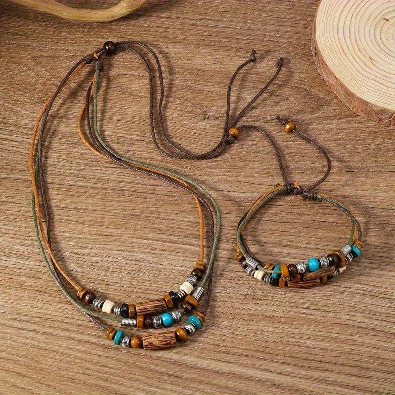 This set features a unique bohemian design with wood beads in brown and turquoise colors. Perfect for adding a touch of vintage charm to your outfit.