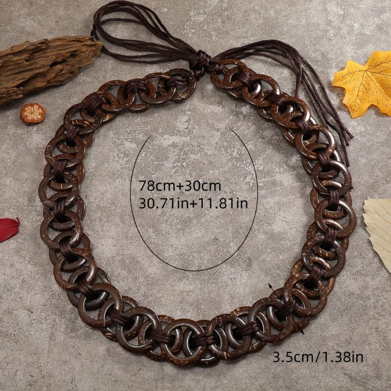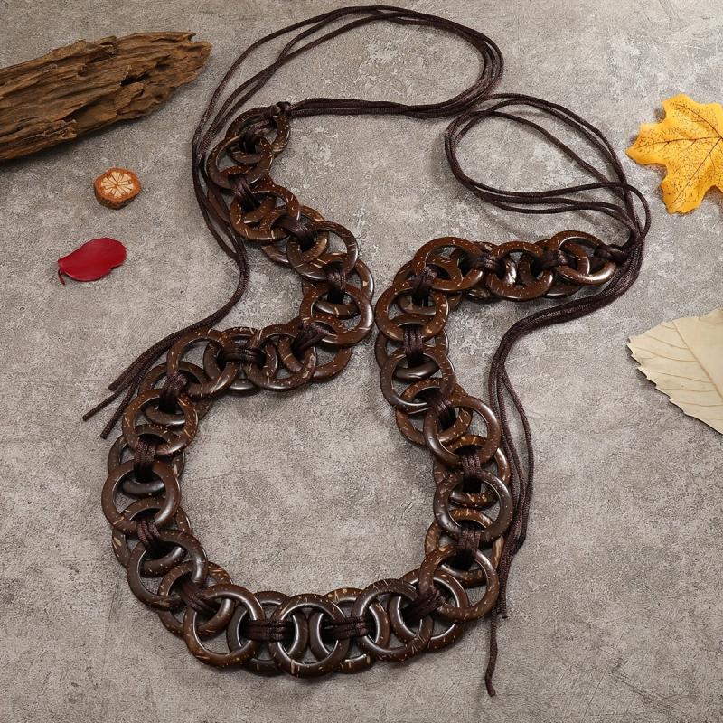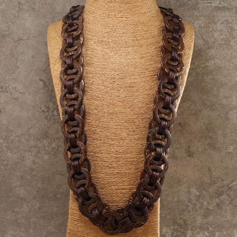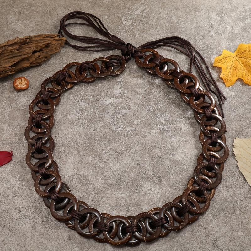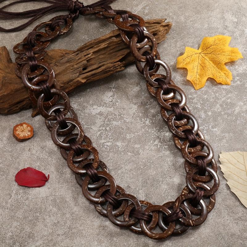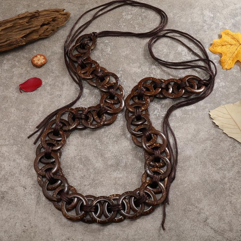 Handcrafted ethnic style wooden beaded necklace with intricate knots, perfect for daily wear or gifting. A unique everyday accessory with a bohemian touch.