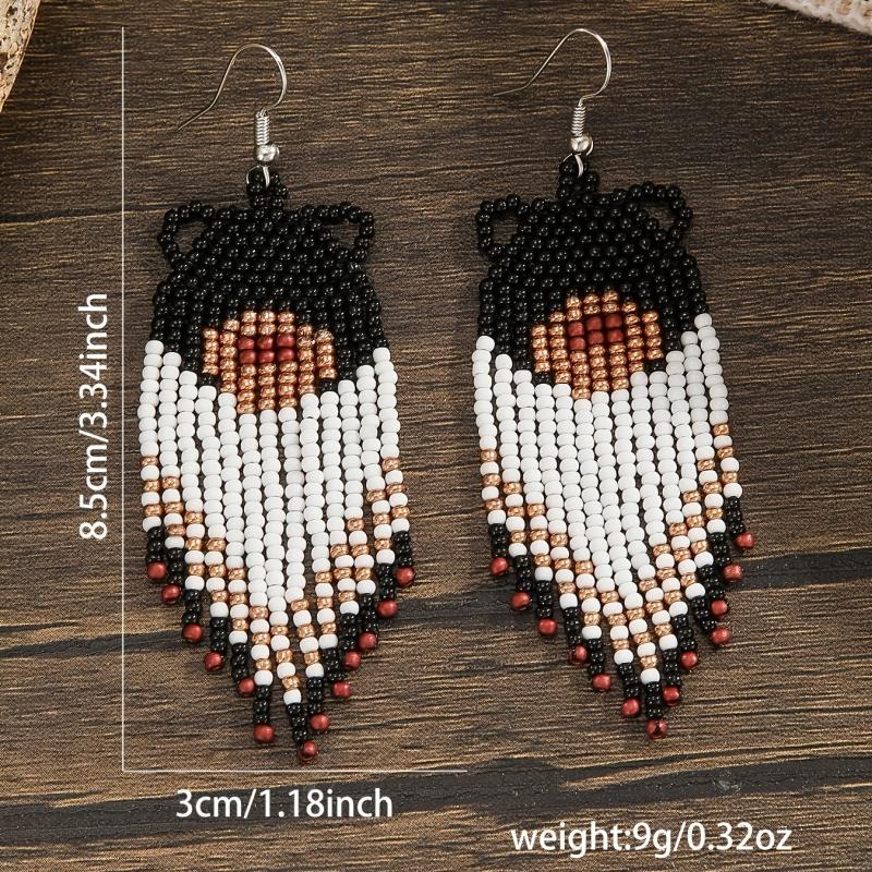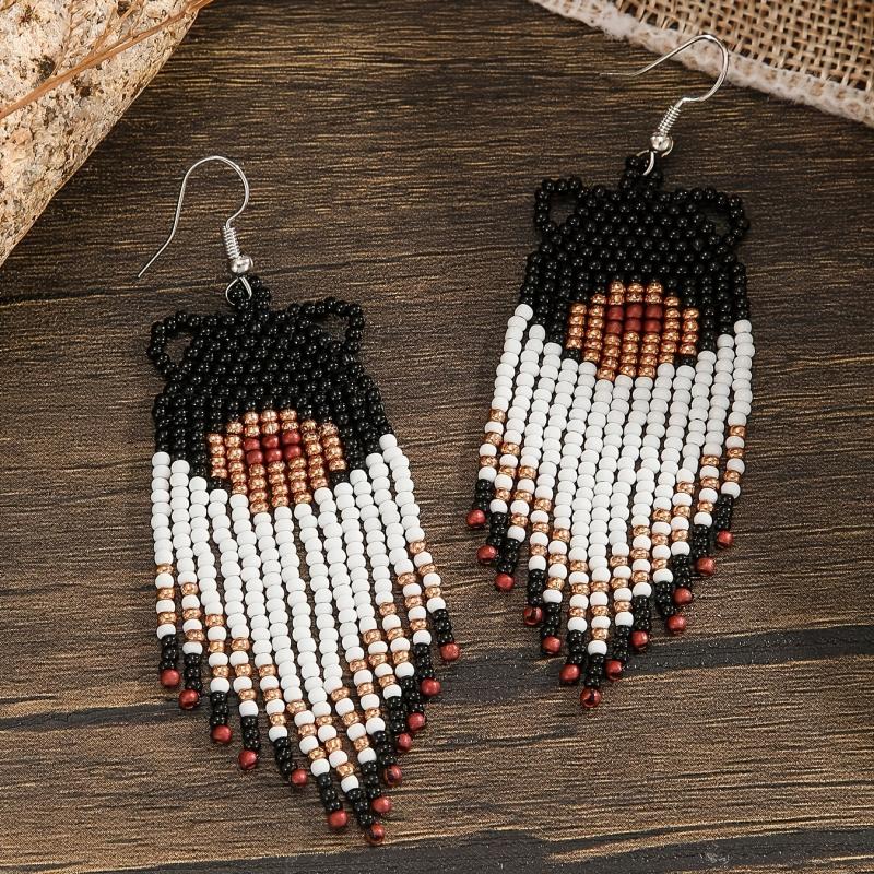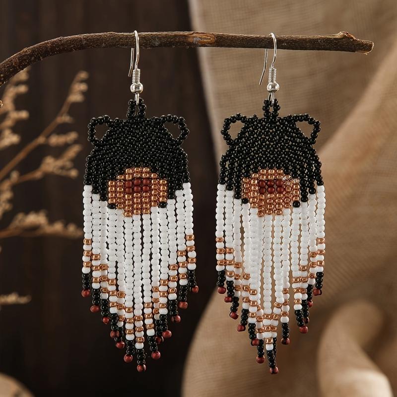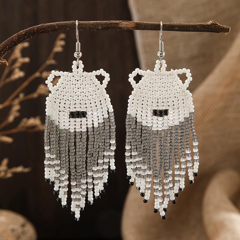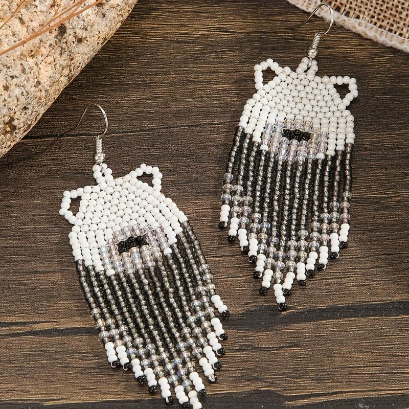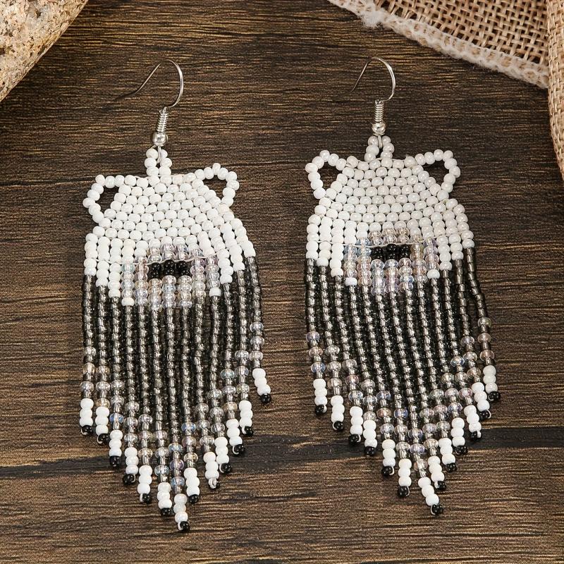 Handcrafted bear pattern tassel dangle earrings with copper posts. Perfect for adding a boho touch to your outfit.