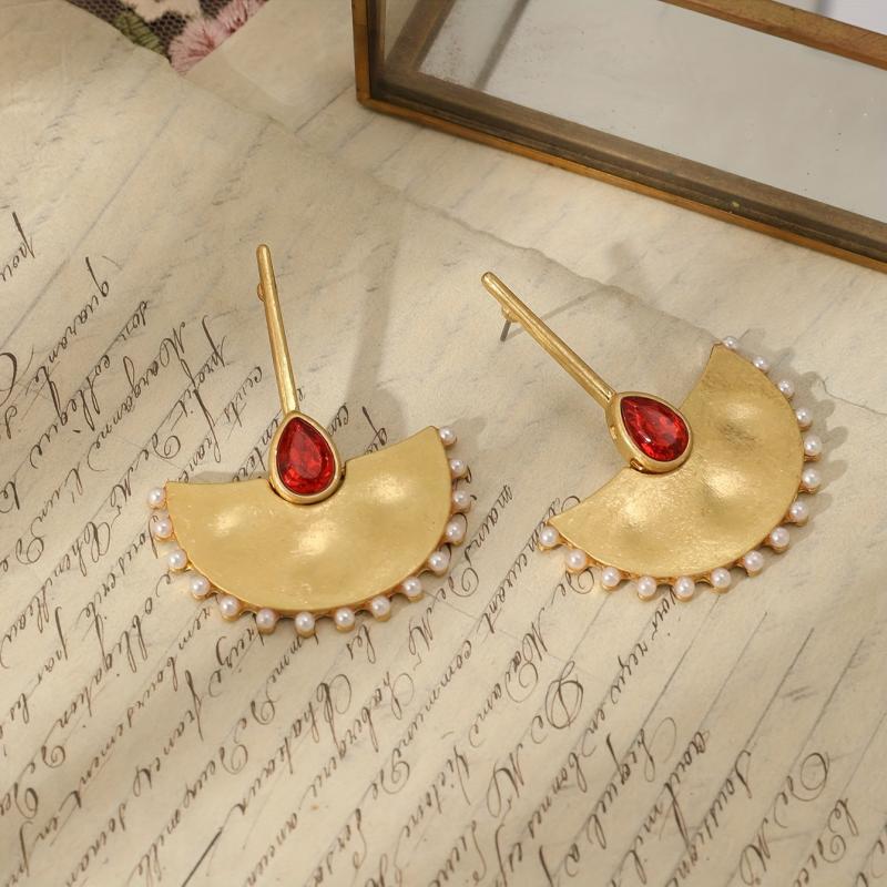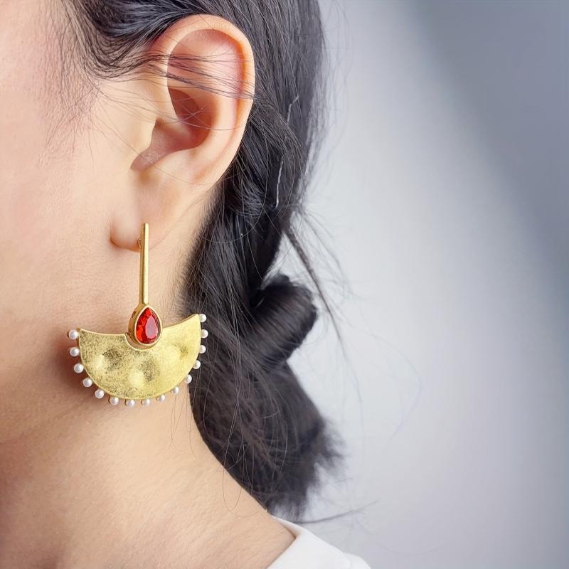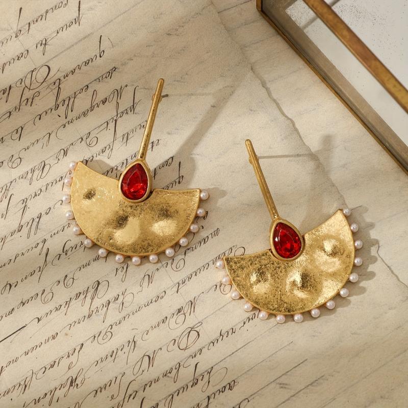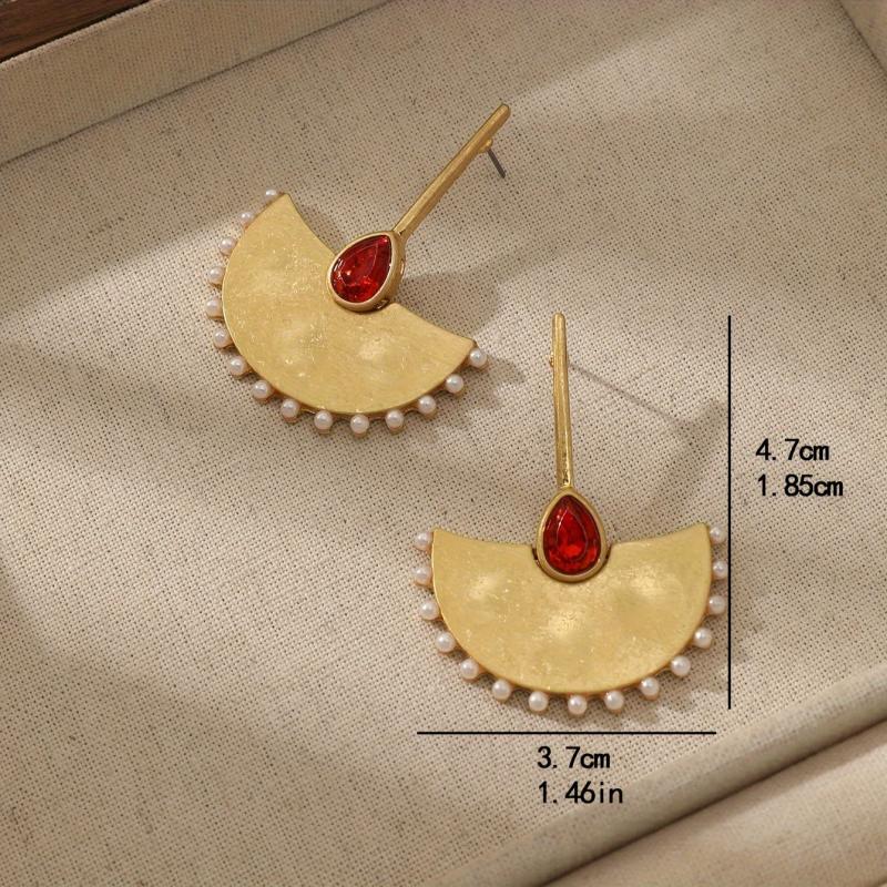 Golden plated earrings featuring red and clear gemstones, perfect for everyday wear or parties. Ideal gift for girlfriends.