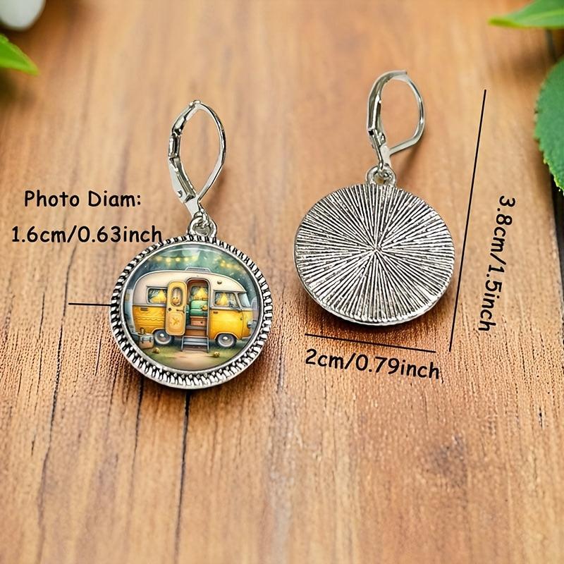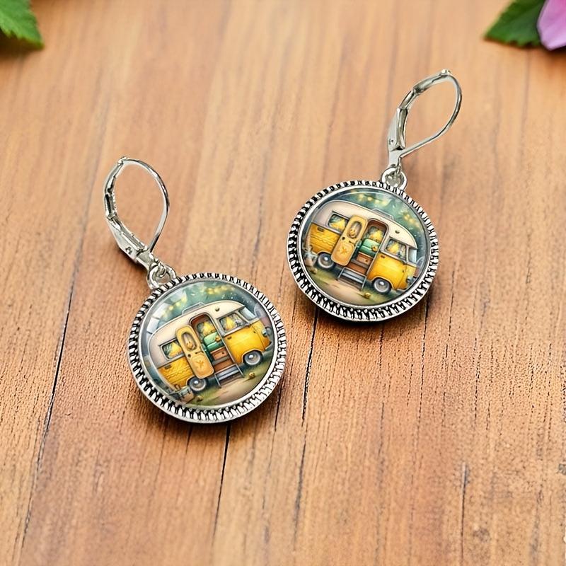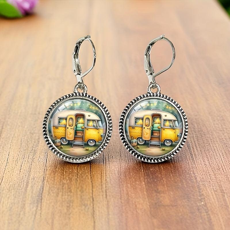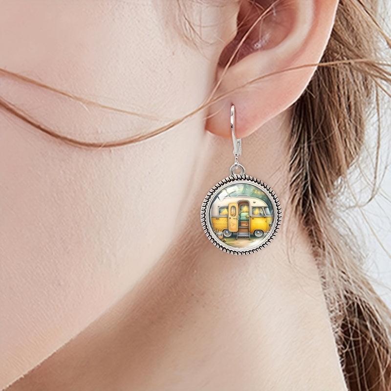 Whimsical vintage camping van earrings featuring round glass pendant with yellow and brown zinc alloy base. Perfect for daily wear and adding a touch of fun to your outfit.