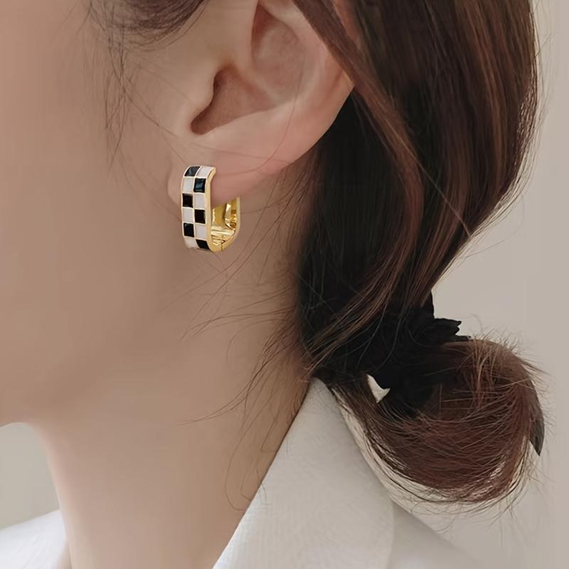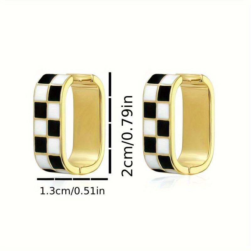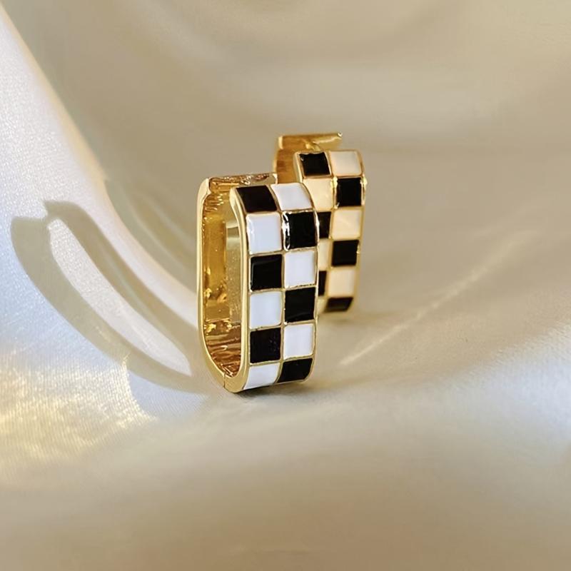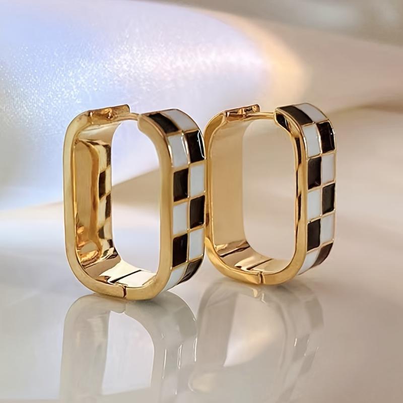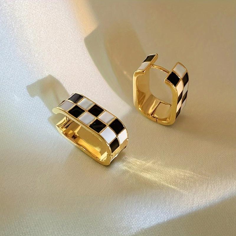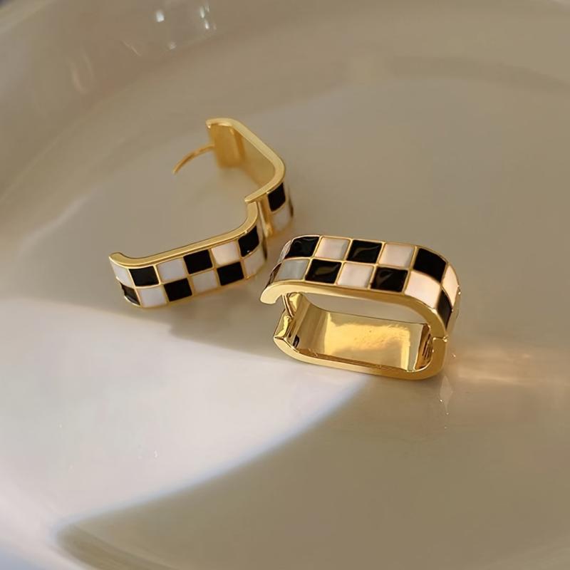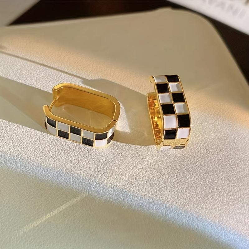 Vintage Checkerboard Pattern Stud Earrings 18K Golden Plated